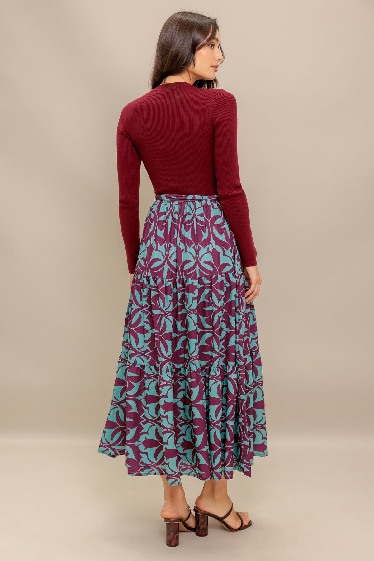 A sweater knit top and printed woven midi dress featuring round neckline, long sleeve and tiered skirt with sash tie