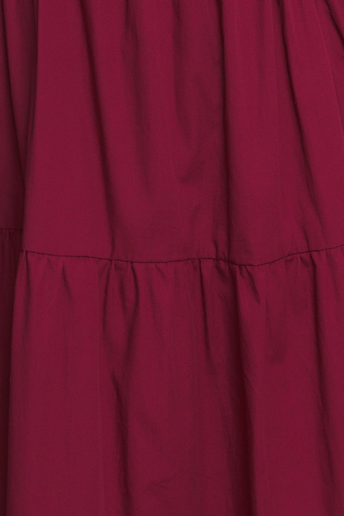 A solid woven maxi dress featuring V neckline with front bow closure, short puff sleeve, elasticized empire and tiered skirt.
