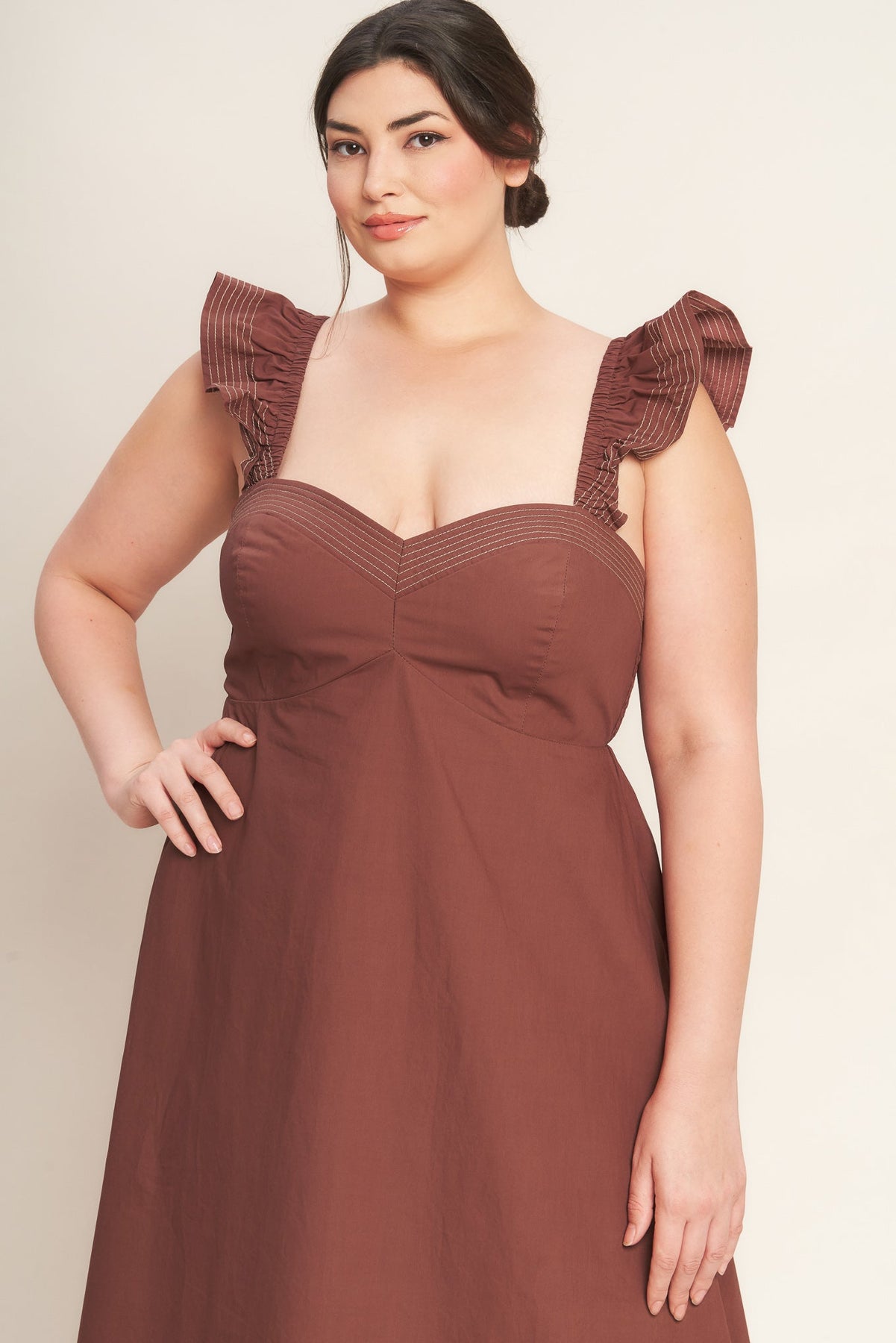 A solid woven midi dress featuring sweetheart neckline, flutter sleeve, center front cut out, circle skirt and smocked back bodice