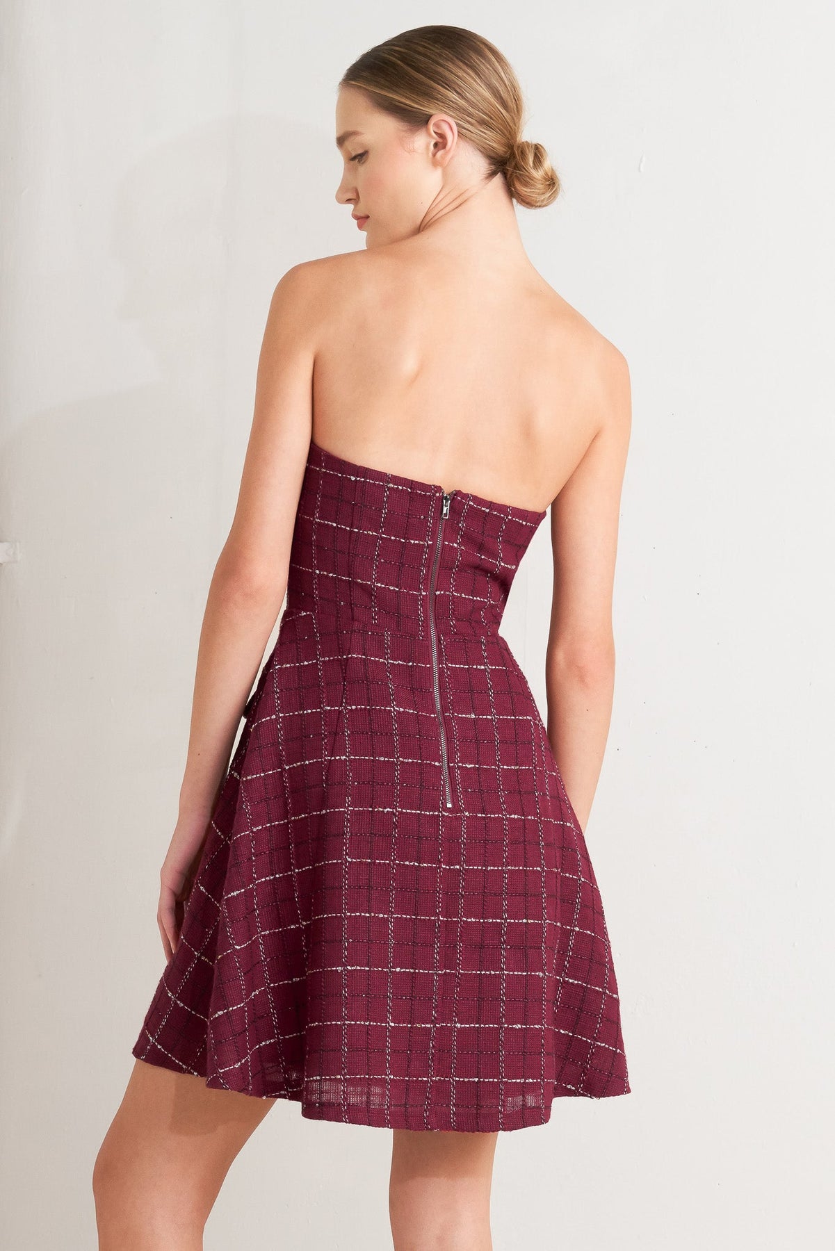 A solid woven midi dress featuring strapless textured woven bodice, full skirt and back zipper closure