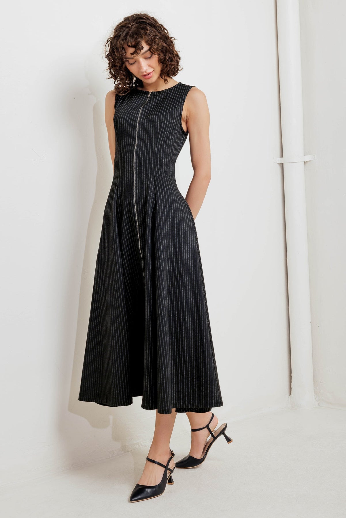 A striped woven midi dress featuring round neckline, sleeveless, circle skirt and front zipper closure