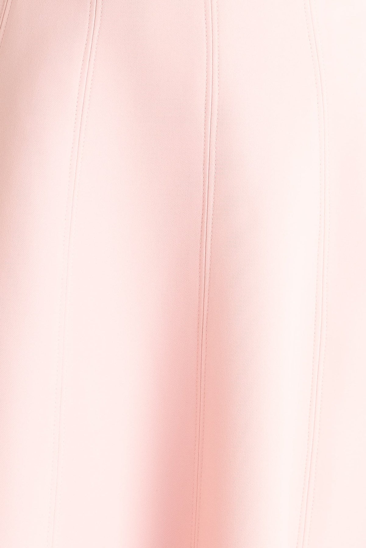A solid woven midi dress featuring strapless with V front, self belt, circle skirt and back zipper closure