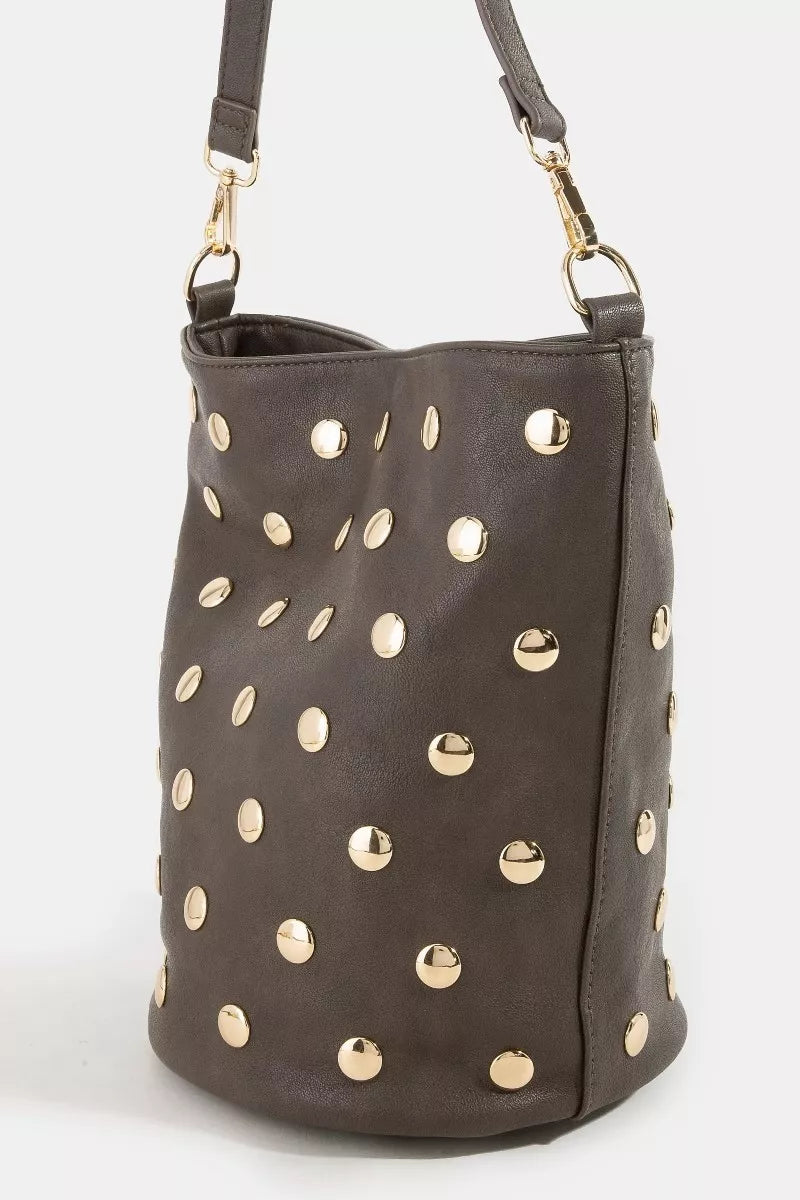 The studded leather bucket bag is a bold and edgy accessory that adds a touch of rock 'n' roll attitude to any outfit. Crafted from high-quality leather, this bag is durable and stylish. The studded detailing creates a unique and eye-catching design that exudes a sense of individuality. With its bucket shape, this bag offers ample storage space for your essentials while remaining stylish and functional. Perfect for adding a rebellious flair to your look, the studded leather bucket bag is a chic statement piece that is sure to turn heads.