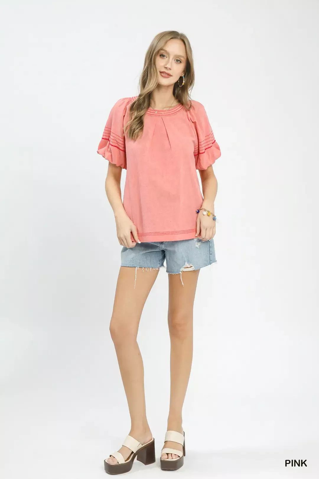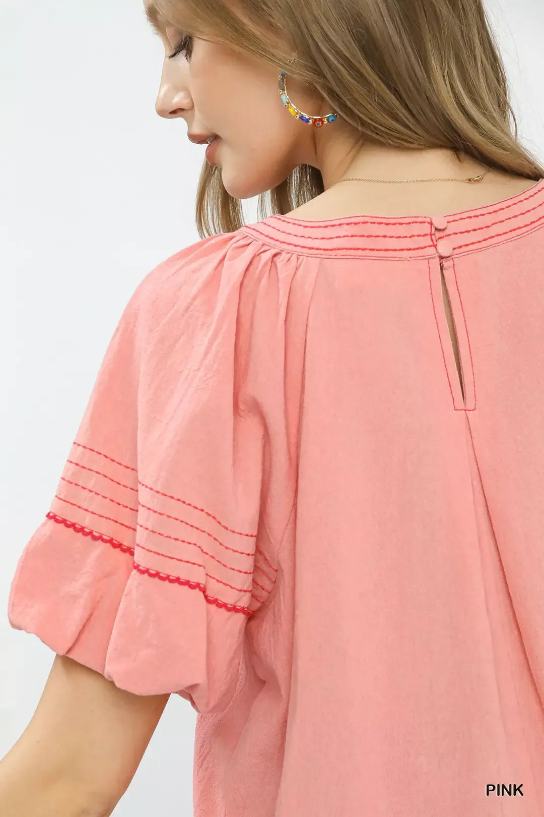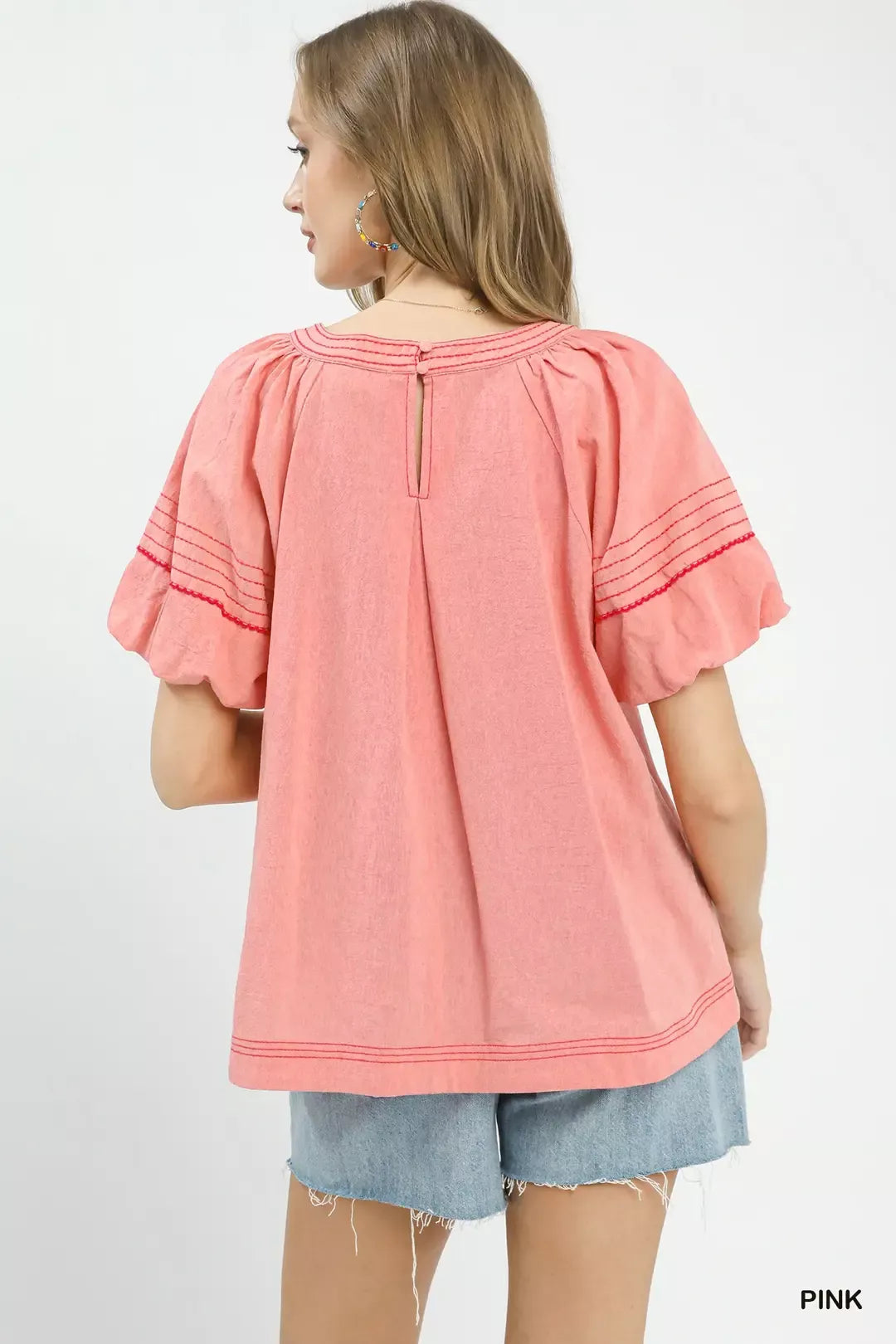 The Solid Round Neck Top is a versatile and stylish piece that adds a touch of sophistication to your outfit. Featuring short puff sleeves, this top offers a feminine and on-trend silhouette. The round neck design provides a classic and flattering look for any occasion. With contrast stitch detailing, this top exudes a modern and chic vibe. The back keyhole button adds a subtle yet elegant touch to the top's design. Additionally, the lined sleeves offer comfort and structure, making the Solid Round Neck Top a versatile and fashionable choice for your wardrobe.