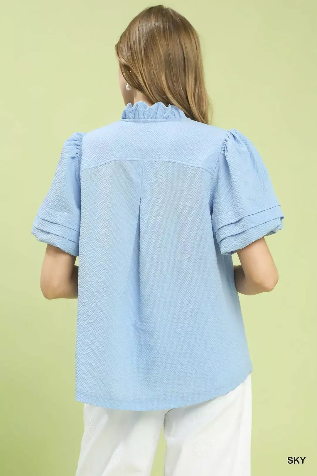 A textured scallop trim puff sleeve blouse features intricate scalloped detailing along the edges of the blouse, giving it a unique and stylish look. The puff sleeves add a touch of volume and drama to the overall design, creating a trendy and feminine silhouette. This blouse is perfect for adding a chic and sophisticated touch to any outfit, whether paired with jeans for a casual look or with dressier bottoms for a more formal ensemble. The textured fabric adds depth and interest to the blouse, making it a fashionable and versatile piece for your wardrobe. Elevate your style with this elegant and on-trend textured scallop trim puff sleeve blouse.