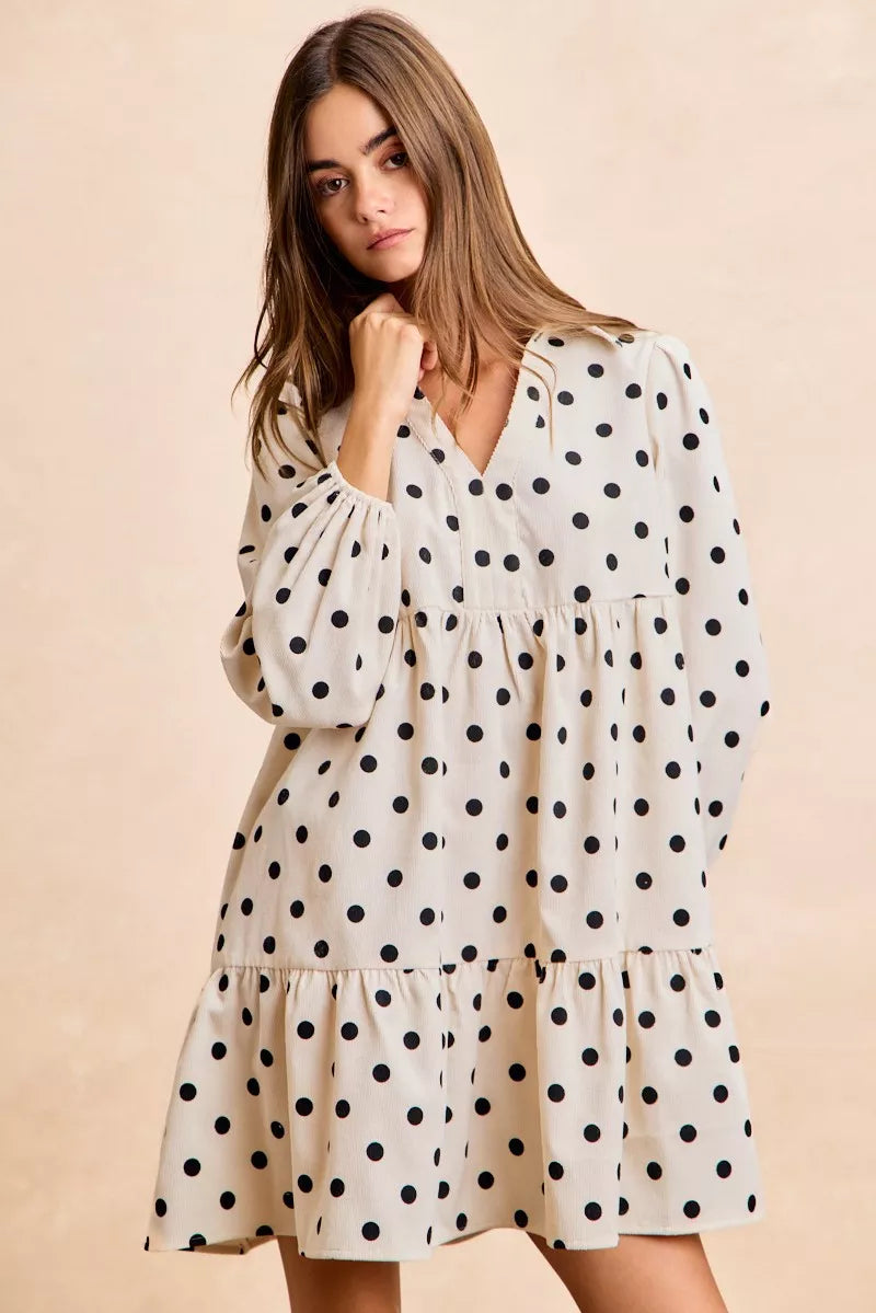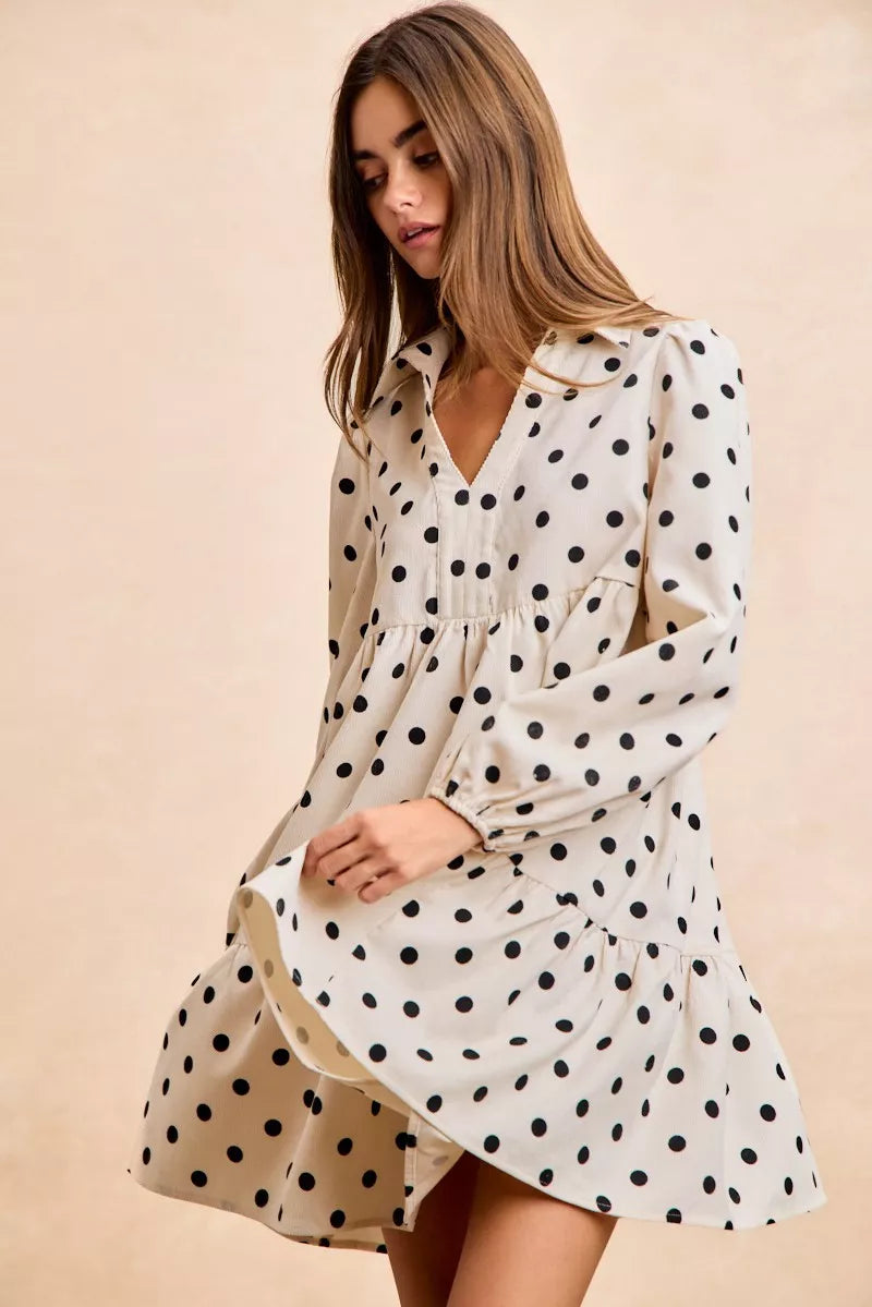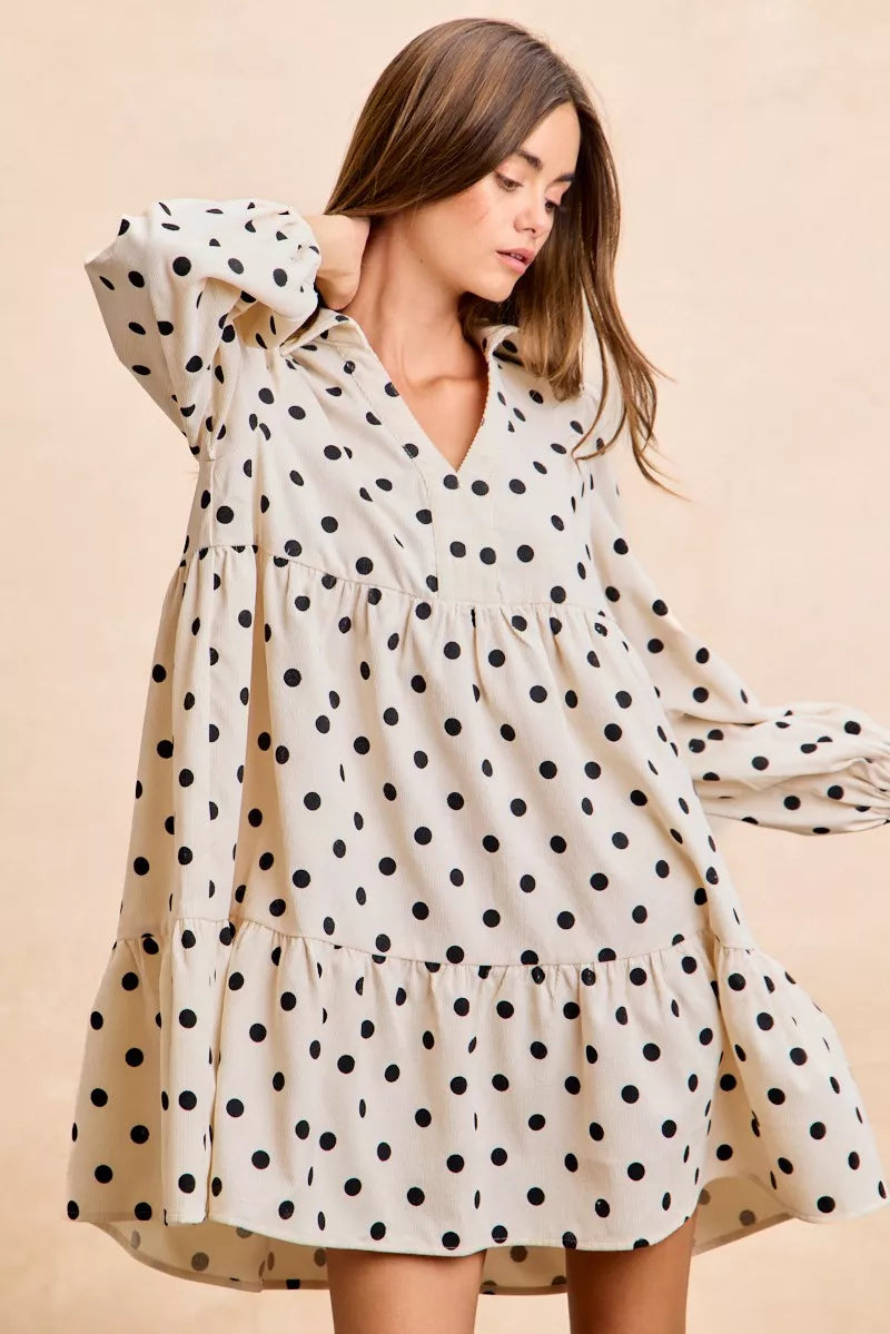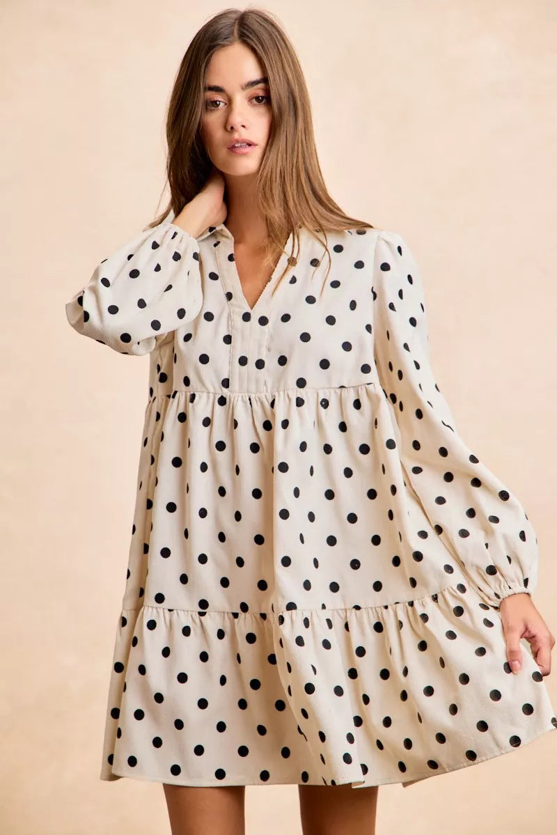 The Polka Dot Corduroy Collared V-Neck Dress is a charming and stylish piece for your wardrobe. With a playful polka dot pattern and cozy corduroy fabric, this dress offers a retro-inspired yet contemporary look. The collared V-neck adds a touch of sophistication to the design. Perfect for both casual and dressier occasions, this dress combines comfort and fashion effortlessly. Step out in confidence and elegance with the Polka Dot Corduroy Collared V-Neck Dress for a chic and timeless ensemble.