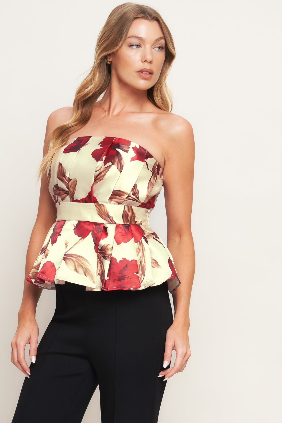 A printed woven top featuring strapless neckline, pleated body, peplum and smocked back bodice. Matching skirt IK7725