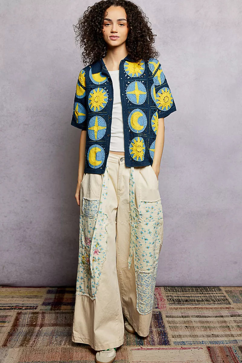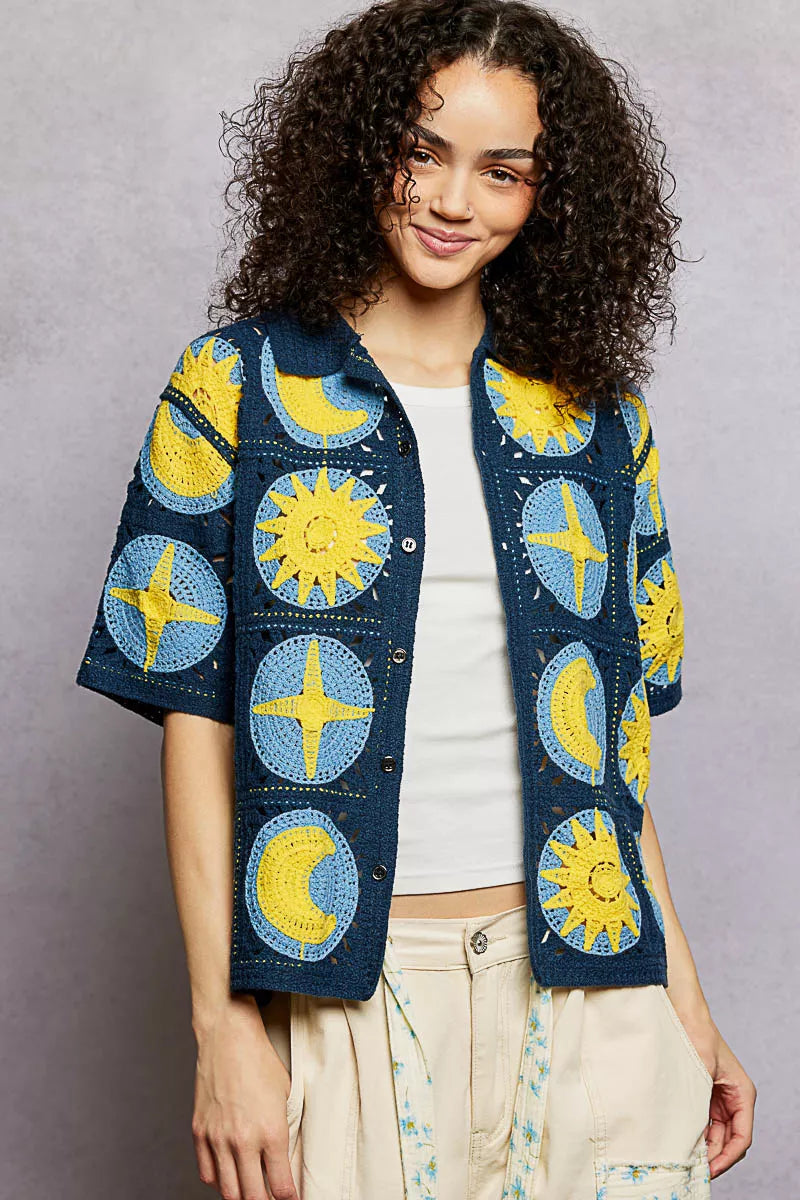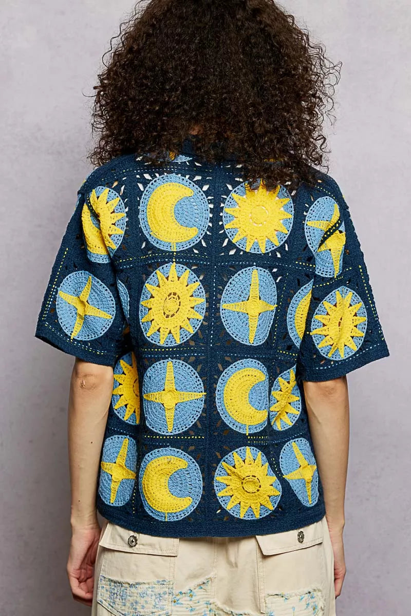 This short-sleeve regular-fit shirt top is crafted in crochet, providing a delicate and textured appearance. It showcases metal button-down detailing for a touch of elegance. The unique star-and-moon pattern adds a playful and whimsical charm to the design, making it a standout piece in any wardrobe.