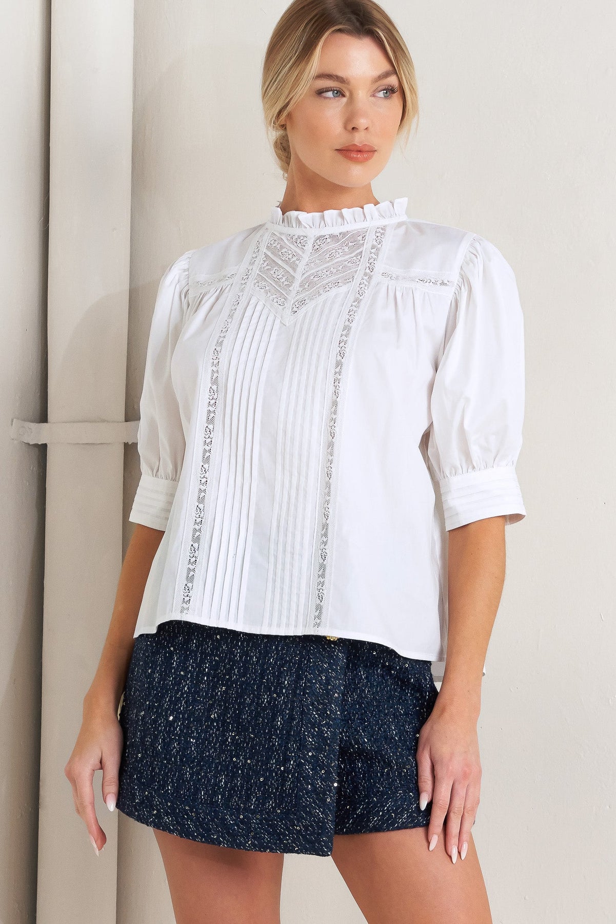 A solid woven top featuring ruffled high neck, pintuck and lace inset, short puff sleeve and back neck button closure