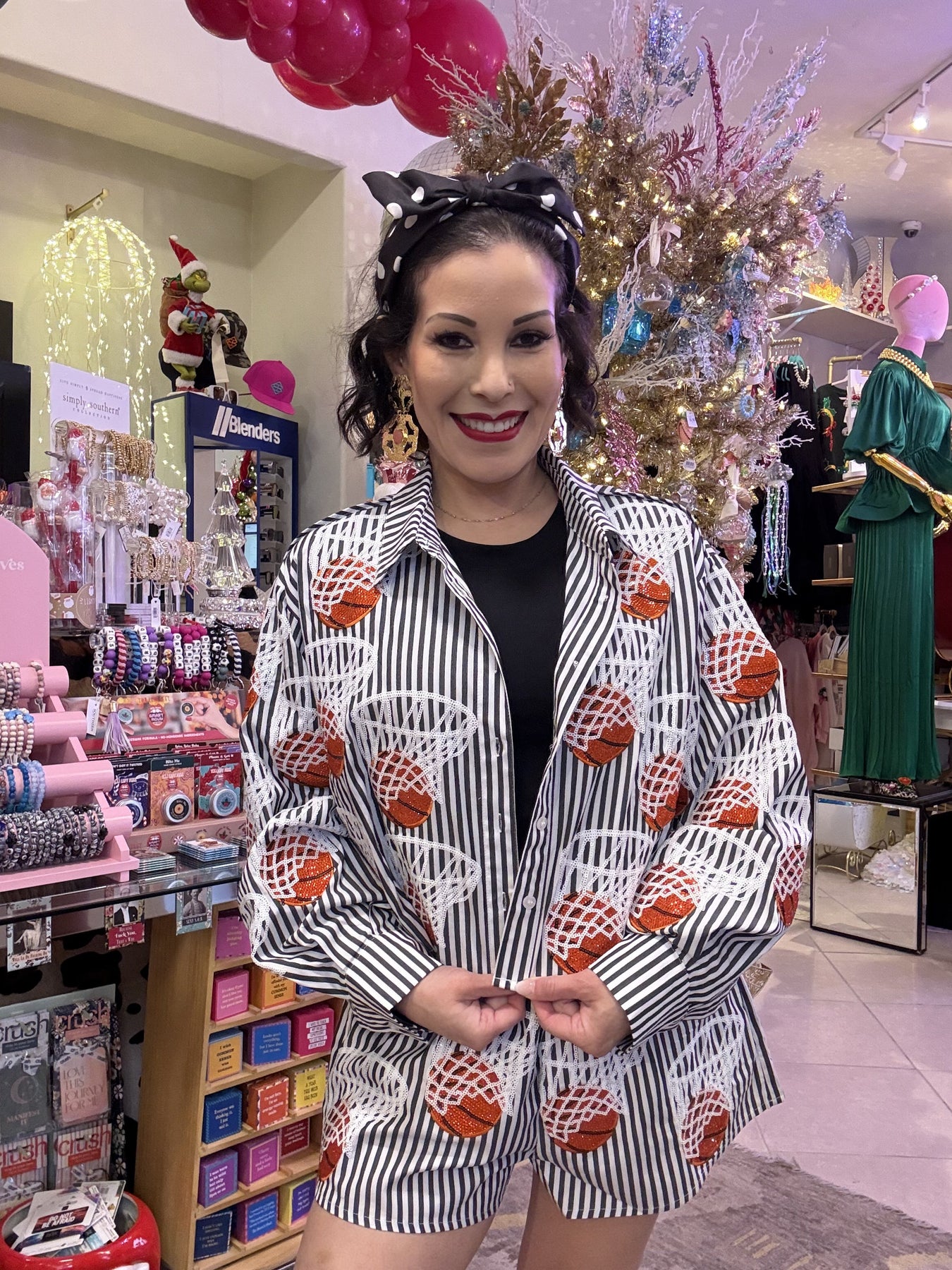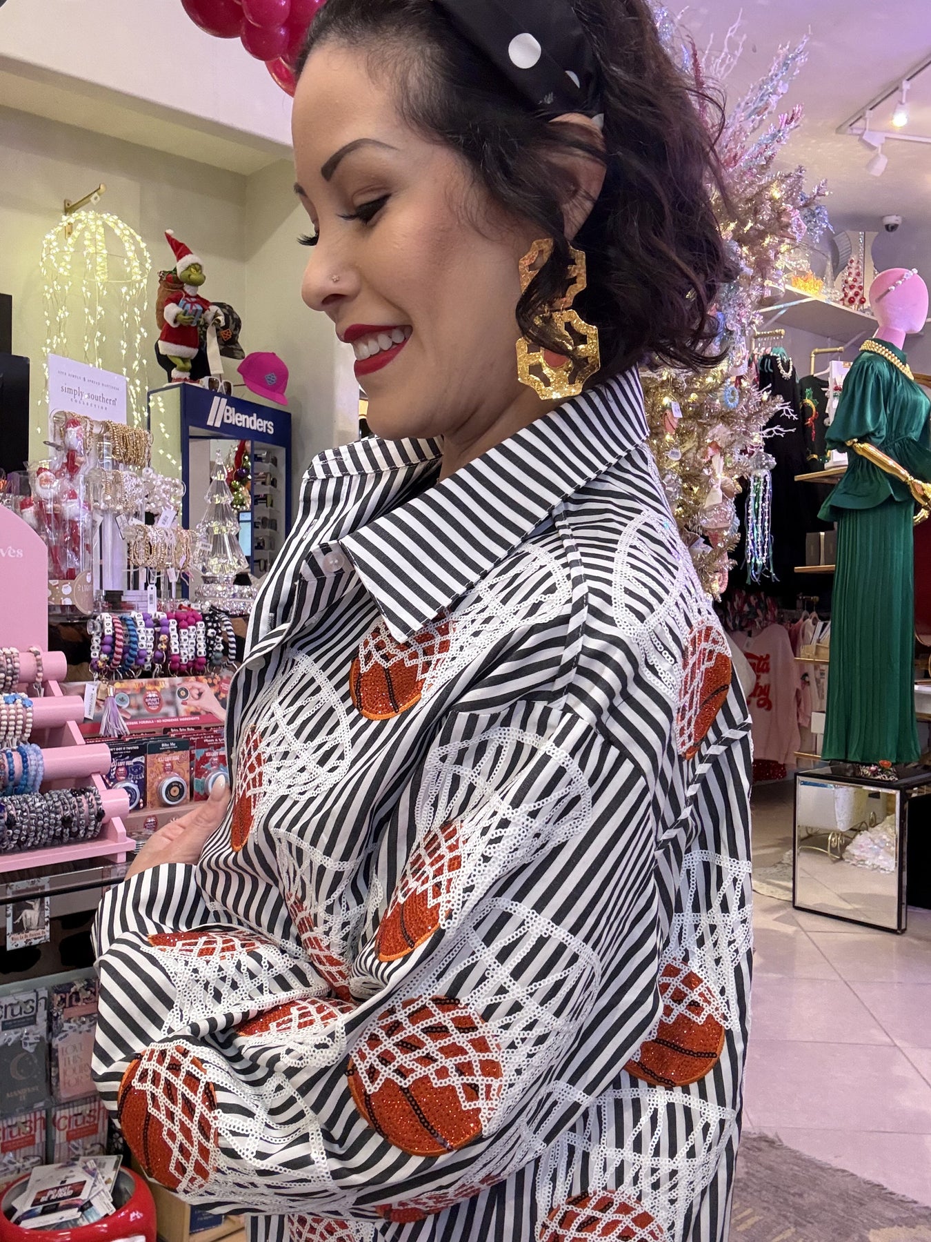 Shoot for style in this playful button-up top featuring bold black and white stripes paired with a fun basketball hoop graphic. Perfect for game day or casual weekend vibes, this piece combines sporty flair with a touch of sparkle. The classic stripe pattern keeps things timeless while the basketball design adds personality and charm. Throw it on over a tee or wear it solo for an effortlessly cool look that scores major fashion points. Model is wearing an XS