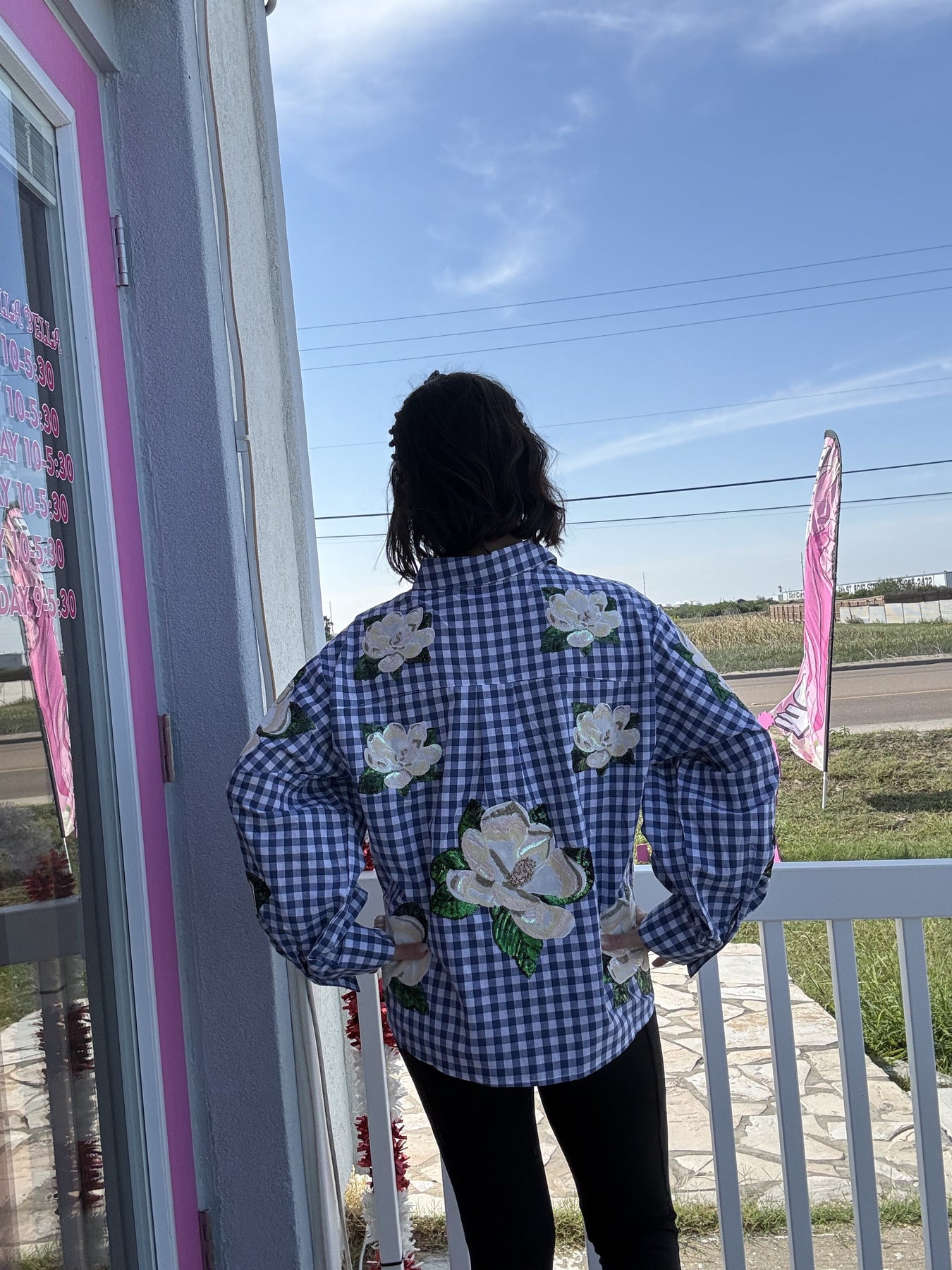 Bring effortless charm to your wardrobe with this delightful button-up top featuring a classic blue and white checkered pattern adorned with scattered magnolia blooms. Perfect for mixing casual elegance with a touch of whimsy, this piece transitions seamlessly from brunch dates to weekend adventures. The crisp checkered design paired with romantic floral accents creates a look that's both timeless and playfully on-trend. Dress it up with tailored trousers or keep it relaxed with your favorite denim—either way, you'll radiate that queen-of-sparkles confidence. Model is wearing an XS