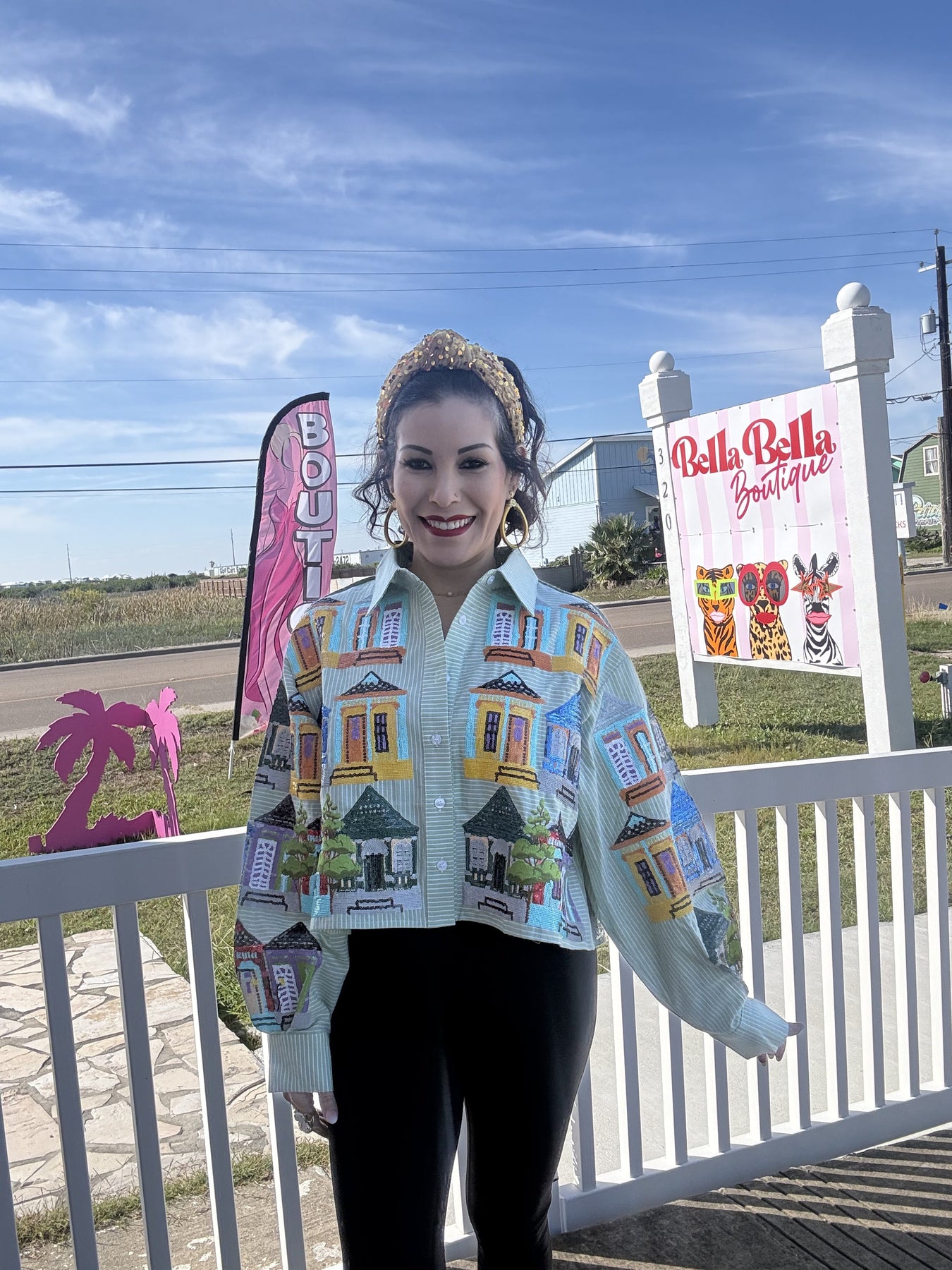 Step into Southern charm with the Queen of Sparkles Pale Green Nola Porches Button Up Cotton Top. This breezy cotton essential captures the relaxed elegance of New Orleans architecture with its soft pale green hue and classic button-up silhouette. Perfect for lazy afternoons on the porch or casual outings around town, it pairs effortlessly with your favorite jeans or linen shorts. The breathable fabric keeps you cool and comfortable, while the timeless design ensures you'll reach for it season after season. A little sparkle, a lot of style—that's the Queen of Sparkles way. Model is wearing an XS