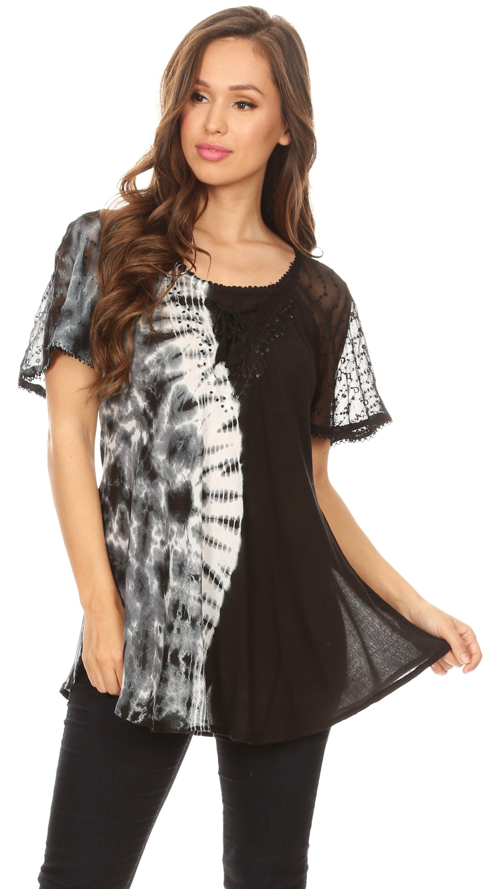 -This top features colorful tie die and solid color, decorative corset tie at front and eyelet lace sleeves. Flattering relaxed fit, great for everyday wear.