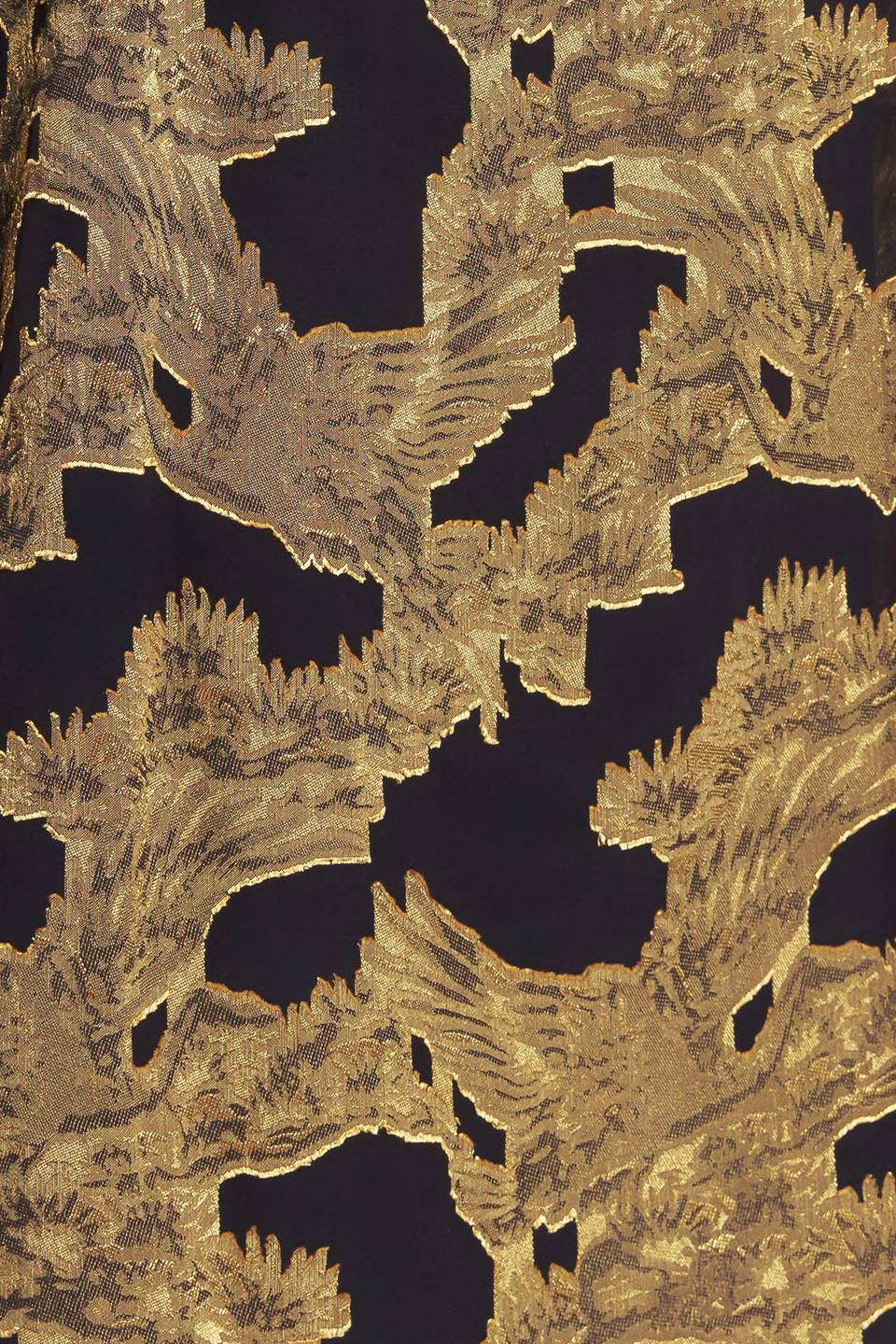 A jacquard woven top featuring high ruffled neckline, front button down, ruffle over shoulder and long sleeve with ruffled cuff