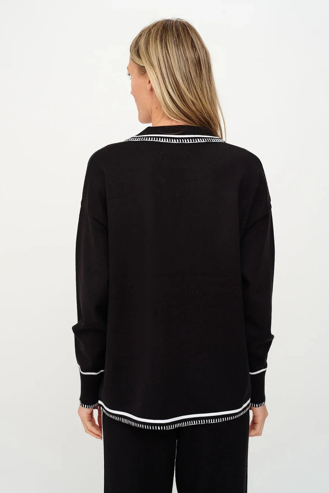 The Kellie Top brings a fun twist to your wardrobe with its cozy yet polished vibe. Crafted from a soft rayon blend, it features a stitched v-neckline framed by a chic collar, creating a sleek silhouette. The classic black base is accented with crisp white stitching along the collar, cuffs, and hem for a tailored finish. Whether paired with jeans for a casual day or styled with the matching Kellie Pants for a coordinated look, this top effortlessly elevates any outfit.