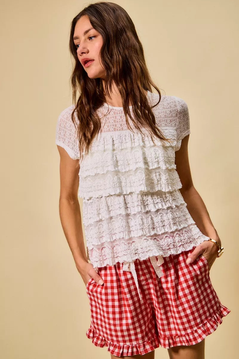 The Ruffle Tiered Stretch Lace Short Sleeves Knit Top is a charming and feminine addition to your wardrobe. The tiered ruffle design adds a playful and stylish touch to this top. With short sleeves and stretch lace fabric, it offers both comfort and style. This top is versatile enough to be dressed up or down for various occasions. Embrace the elegance and uniqueness of this knit top and stand out in style.