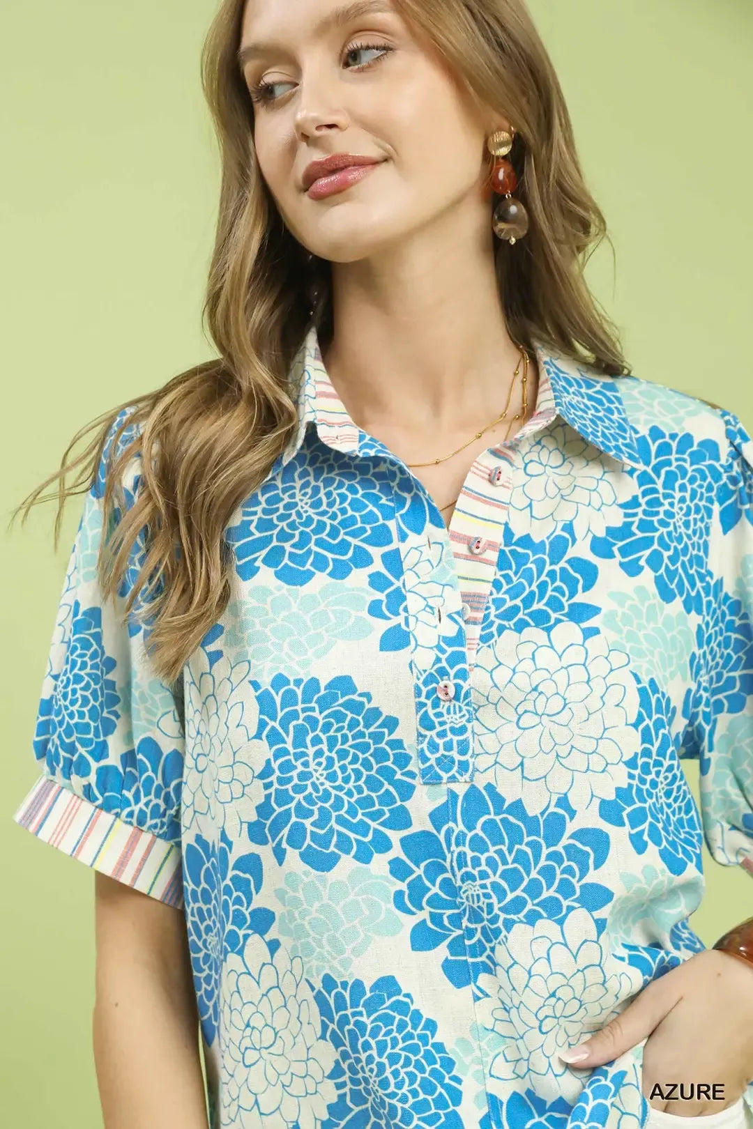 The Floral Collared Short Sleeve Blouse is a charming and versatile piece for your wardrobe. Made from linen, this blouse offers a lightweight and breathable feel. The floral print with multi-stripe contrast adds a cheerful and vibrant touch to the design. Featuring a collared V-placket, this blouse exudes a classic and polished look. The short sleeves with striped contrast cuffs provide a trendy and stylish detail. Perfect for adding a pop of color and femininity to your outfit, the Floral Collared Short Sleeve Blouse is a chic and playful top for various occasions.