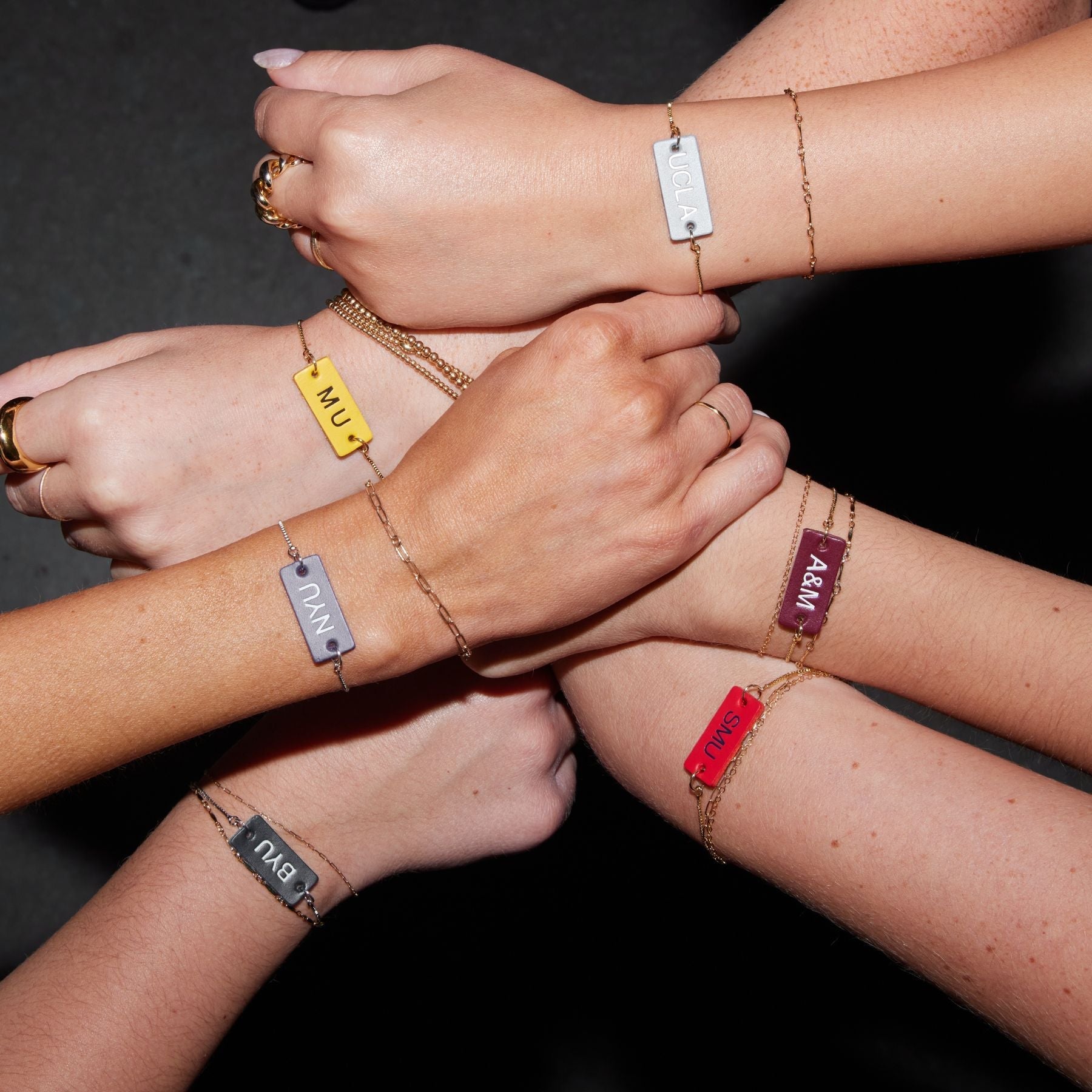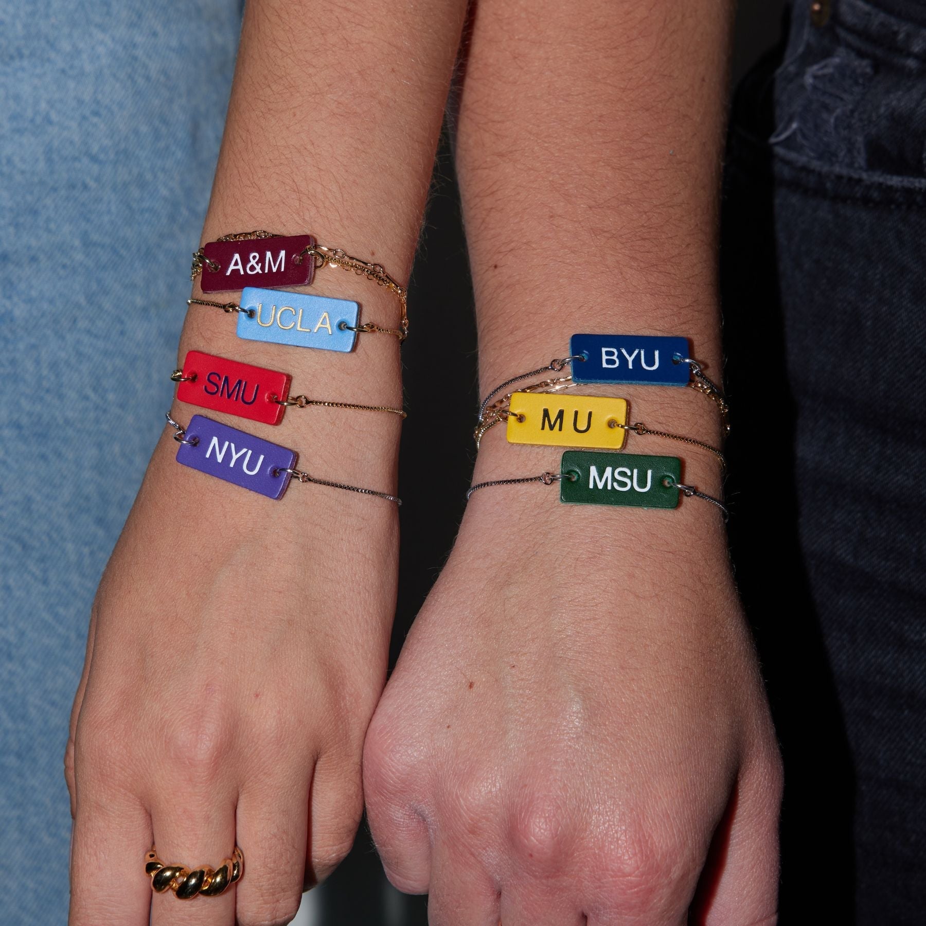 Stand out with the Silver ID Bolo Bracelet! This custom bracelet features a custom monogrammed leather piece, available in rhodium plated silver metal and different options of leather and foil colors. Show off your unique style and express your team spirit in a stylish way!