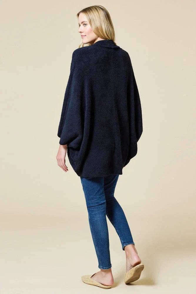 An effortless layer with a modern cocoon silhouette, the Marshmallow Shrug in Black drapes softly around the body for a relaxed yet refined look. Crafted in Softies’ signature marshmallow knit, it delivers feather-light warmth with a cloud-like hand feel. The deep black tone adds sophistication and versatility, making it an elegant lounge-to-out layering piece designed for everyday ease.