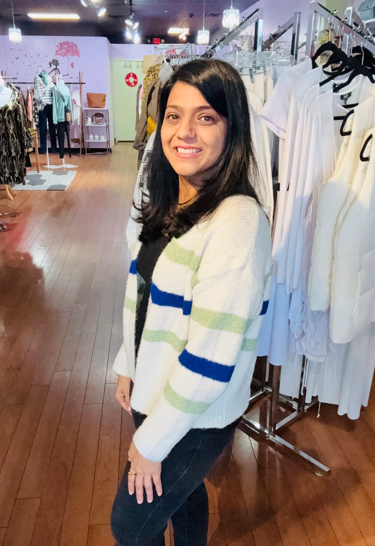 Drape yourself in understated sophistication with this elegant striped cardigan, crafted from sumptuous soft fabric in complementary blue and green tones. The refined vertical stripe pattern adds visual interest without overwhelming, while the relaxed fit ensures effortless comfort for layering or standalone wear. Perfect for transitional seasons, this versatile piece pairs seamlessly with everything from tailored trousers to casual denim, making it an essential addition to any discerning wardrobe.