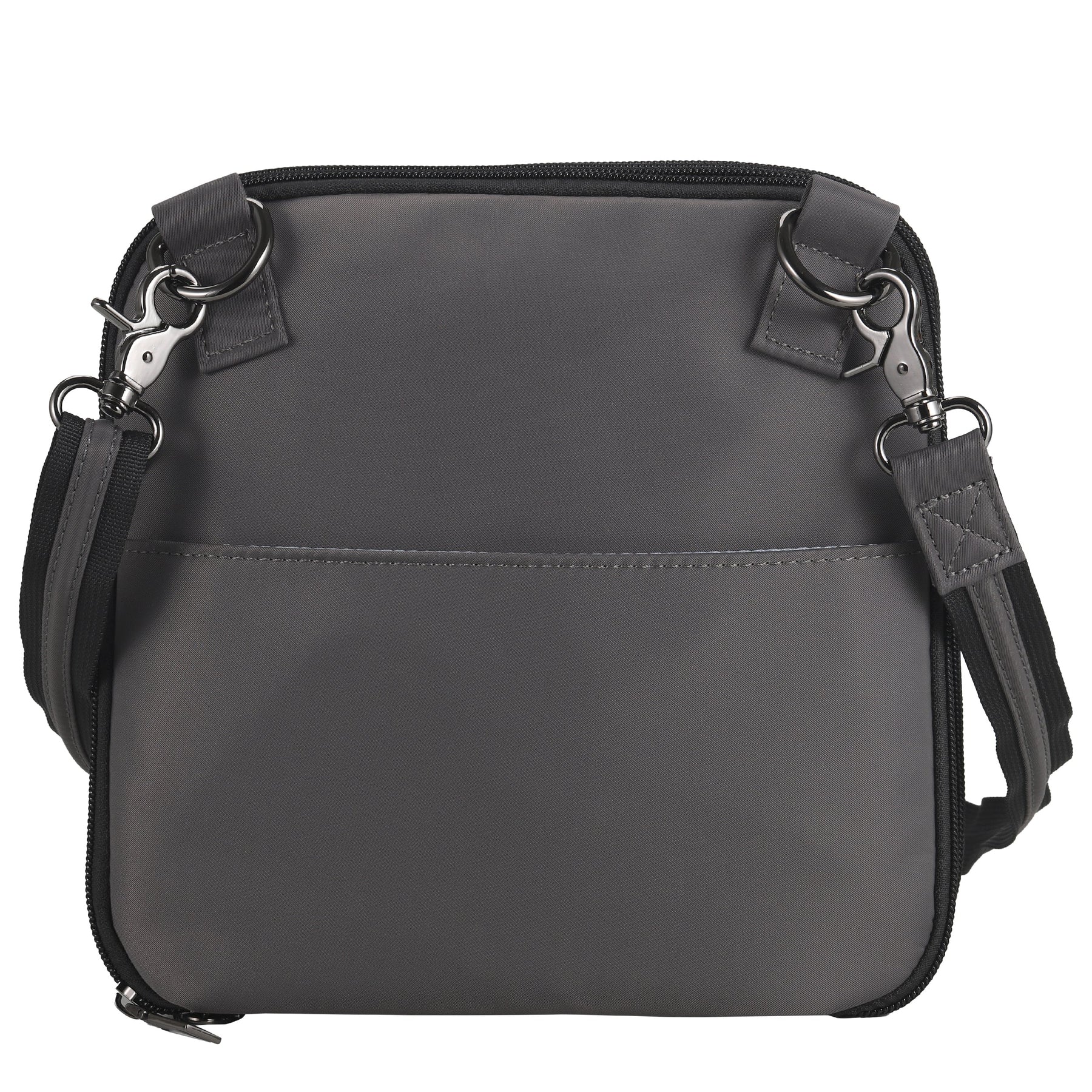 Additional exterior storage includes a full-length slip pocket on the back for a cell phone, along with a front zipper pocket and two front slip pockets for easy access items. The adjustable crossbody strap clips on and off and is cut-resistant with embedded wire for added security.
