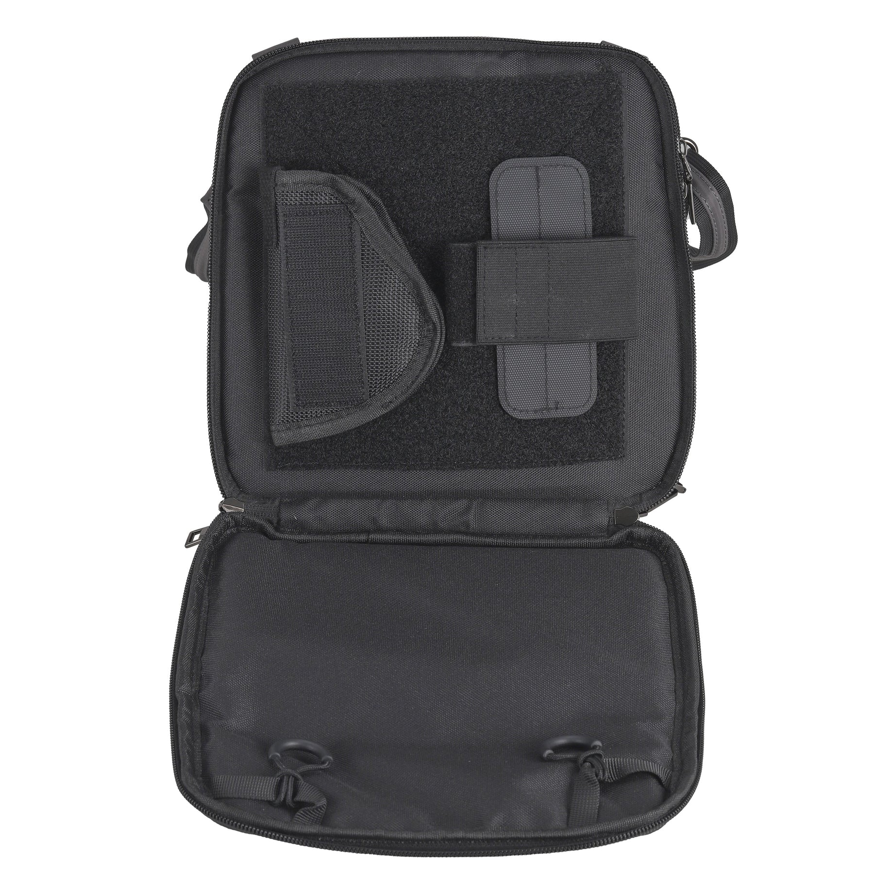 The front compartment is a three-sided concealment pocket designed for discreet carry and fast access. It measures 8.75 inches in length by 8.5 inches in height, accommodating most large-frame handguns. Dual pull tabs on both sides allow for a quick, smooth draw for right- or left-handed users, and the compartment includes two holsters—a universal holster and a wrap-around holster—for a secure, customizable fit.