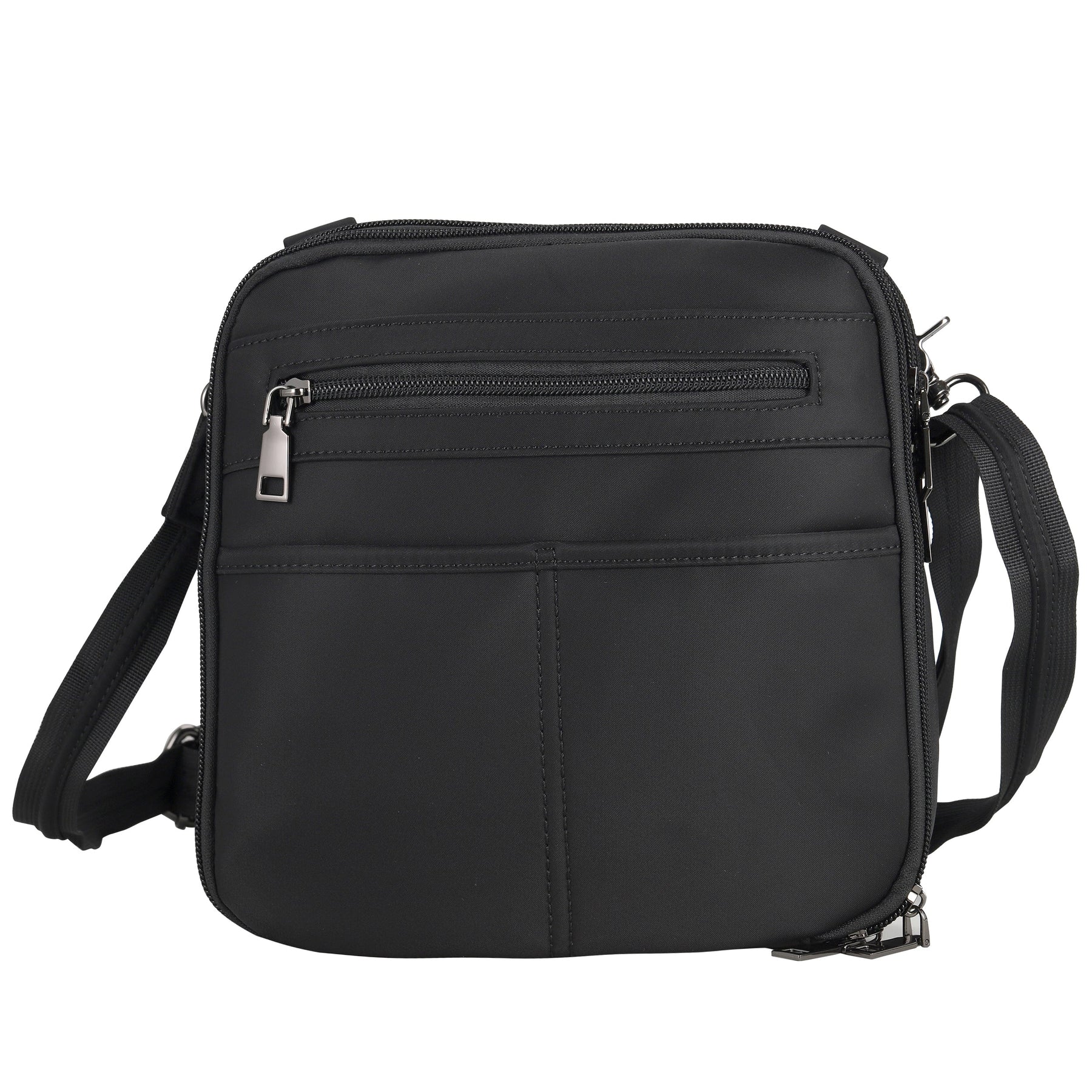 This crossbody features three zippered compartments. The front compartment is a dedicated concealment pocket. The middle compartment provides extra storage and includes an interior zipper pocket for valuables, along with four elastic magazine holders to keep magazines secure and easily accessible. The back compartment functions as an RFID-protected organizer that helps secure your credit cards and features six card slots, a zipper pocket, and a netted slip pocket for small accessories.