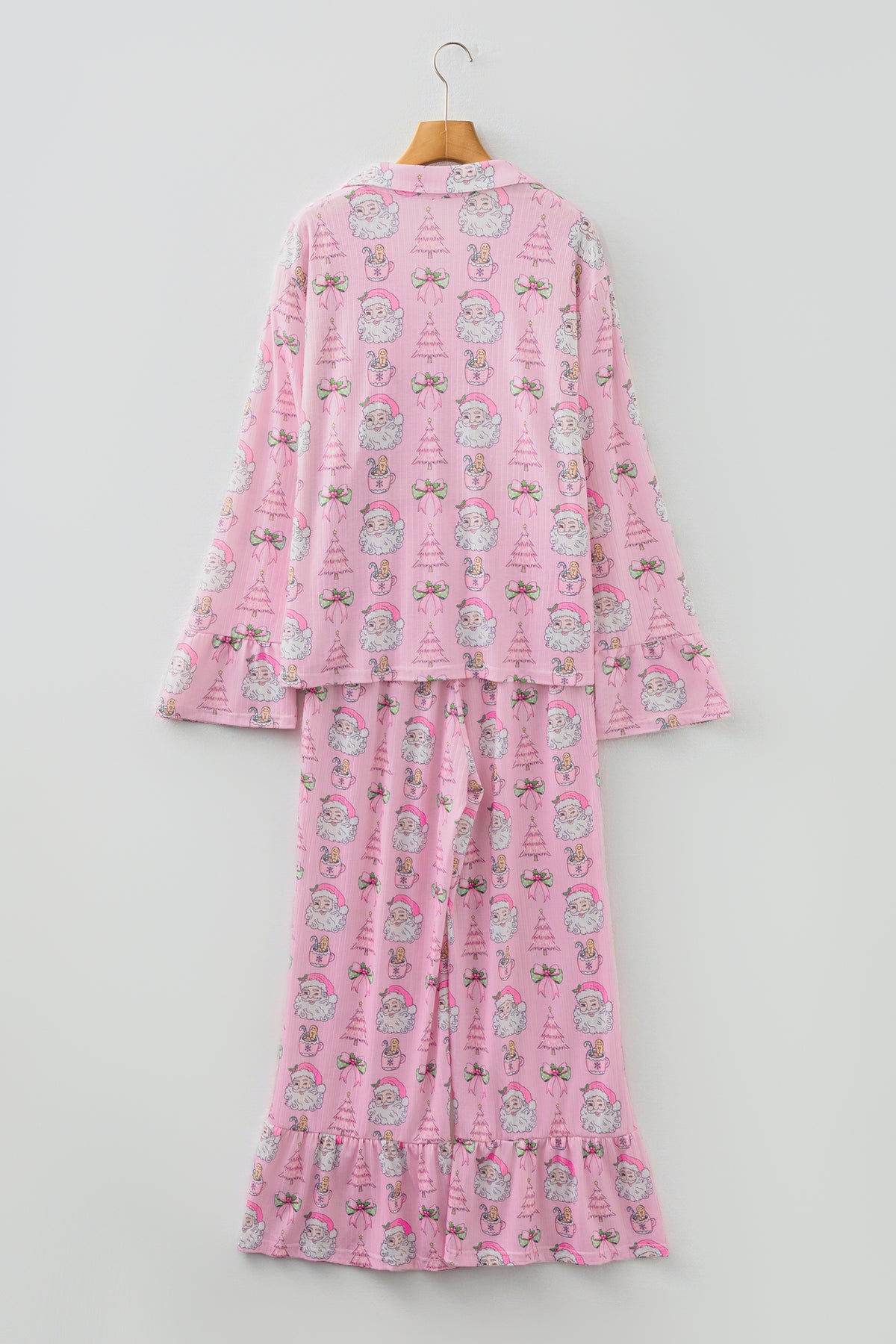 Pink Christmas Print Ruffled Ribbed Shirt & Pants 2 Piece PJ Set