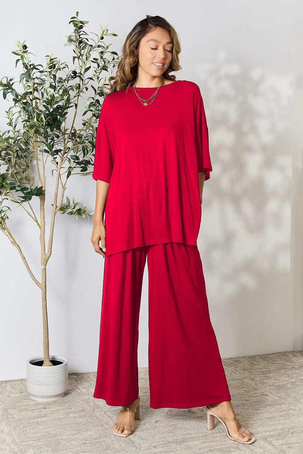 Double Take Full Size Round Neck Slit Top and Pants Set