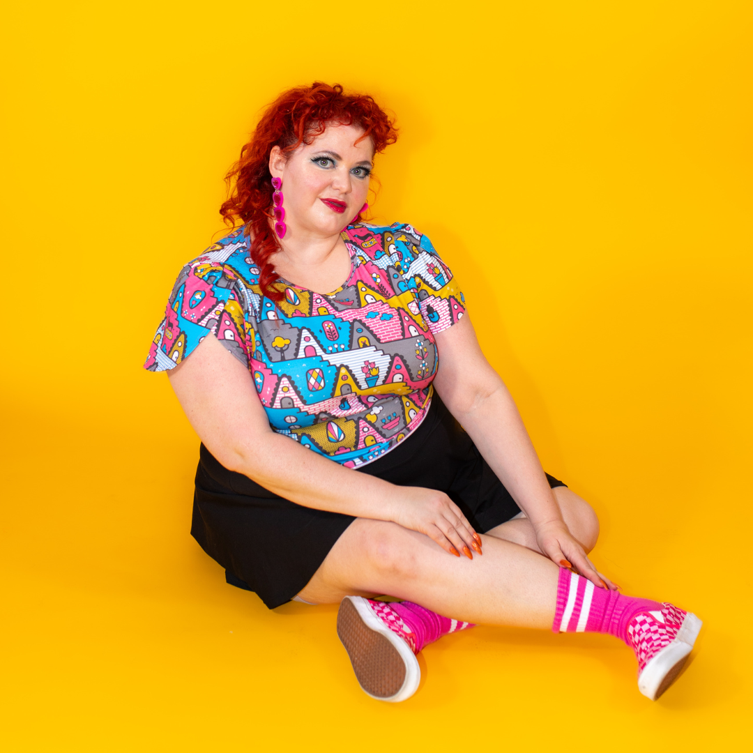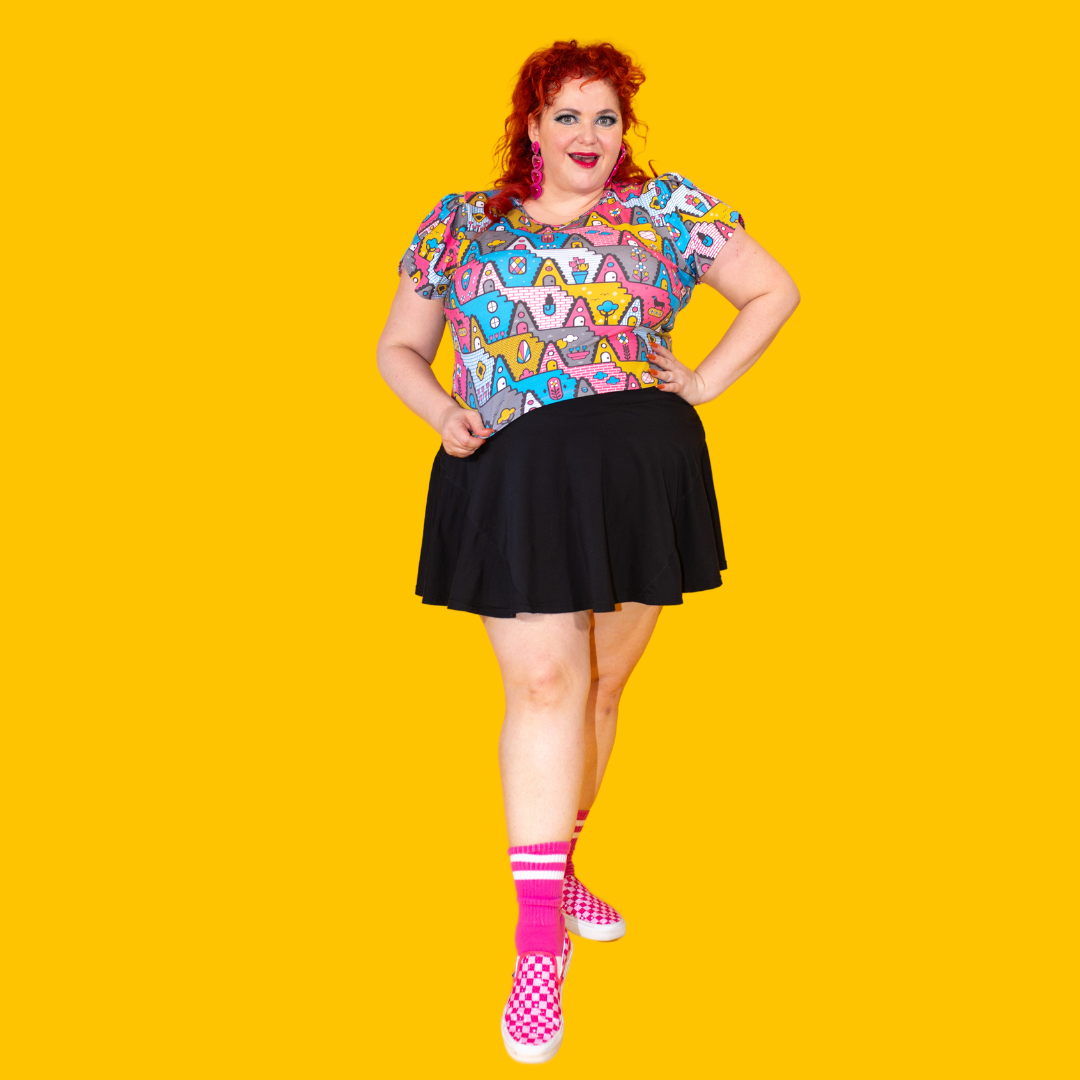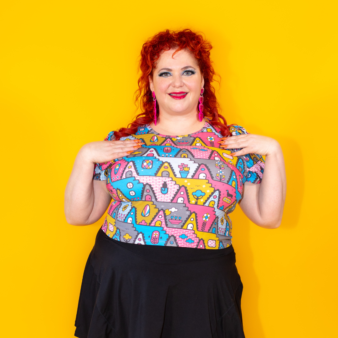 We have made our classic tulip sleeved tee in a more cropped version. This one features our bold '80s-inspired a-frame house print in a fun colorway. The little pets are the most charming part!