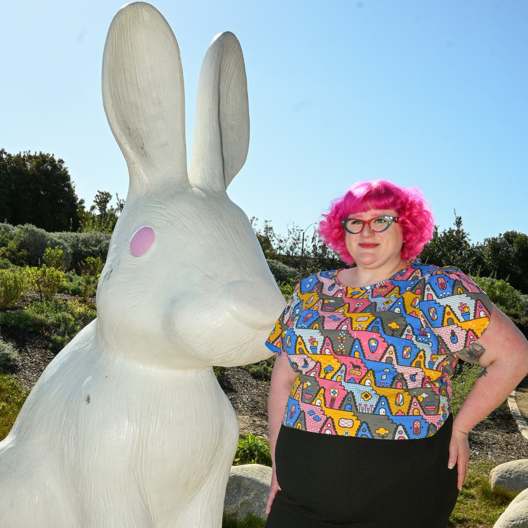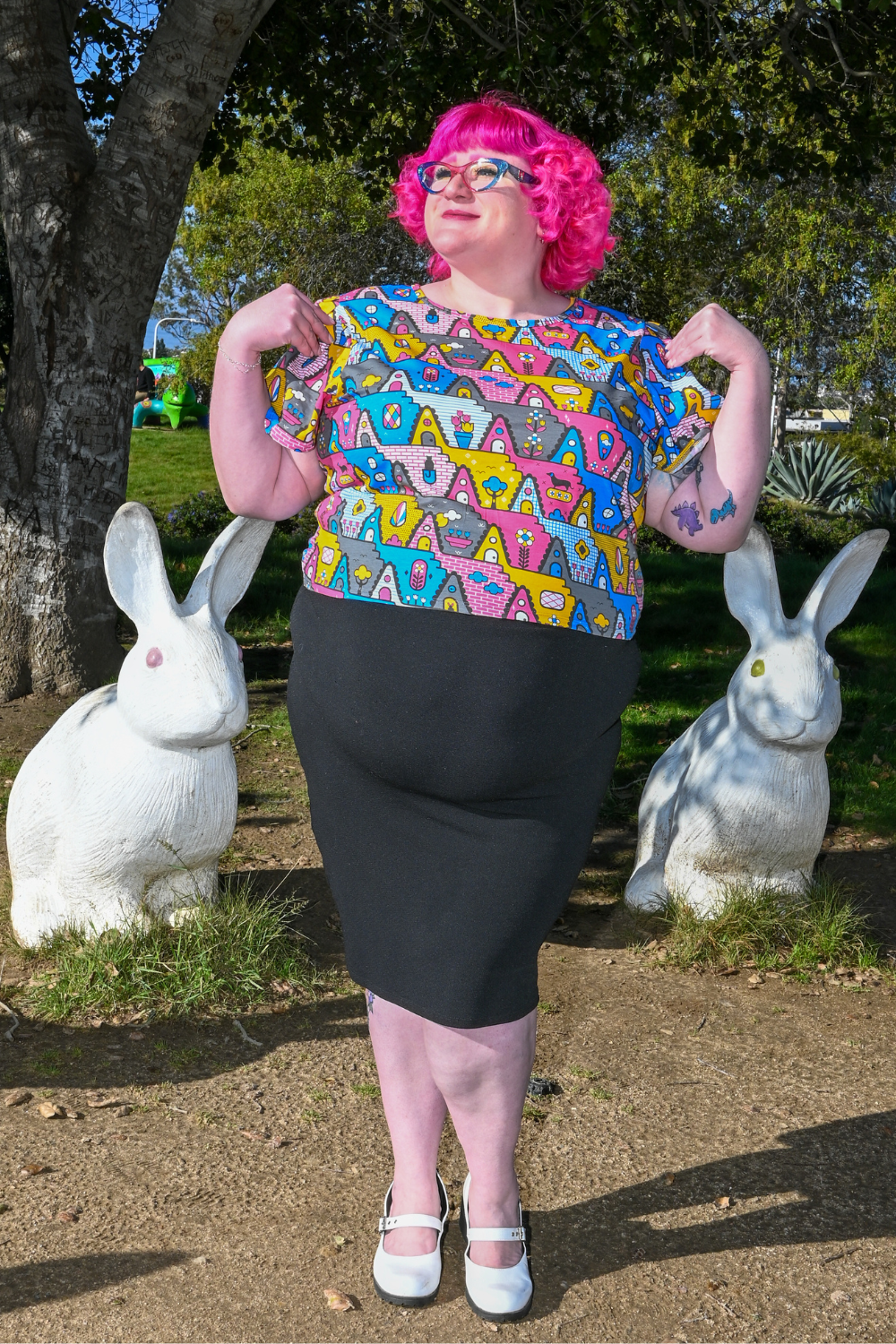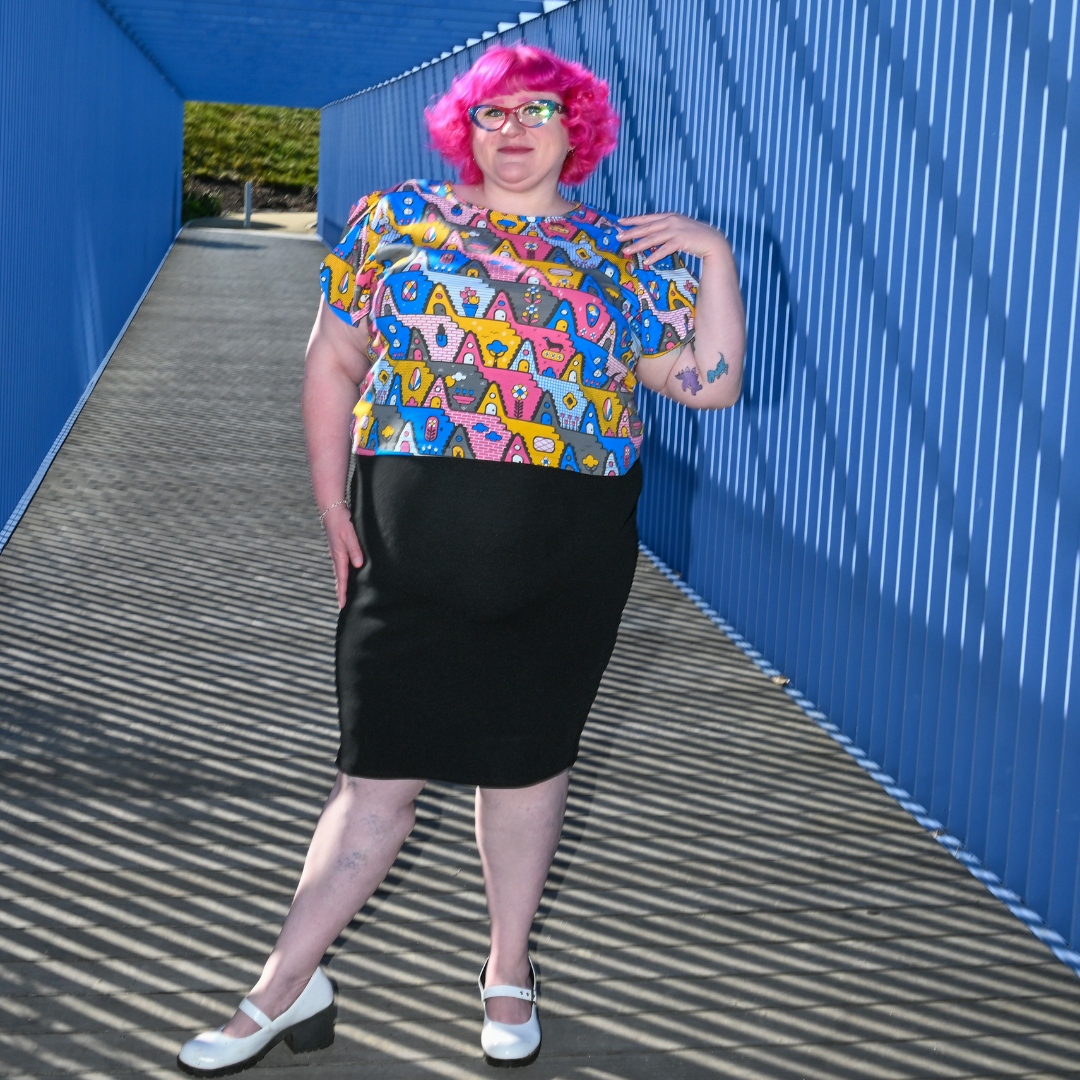 We have made our classic tulip sleeved tee in a more cropped version. This one features our bold '80s-inspired a-frame house print in a fun colorway. The little pets are the most charming part!