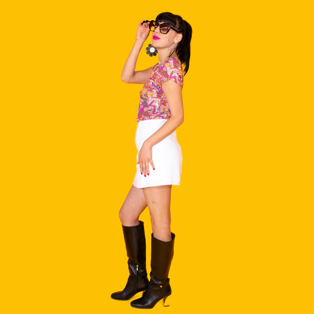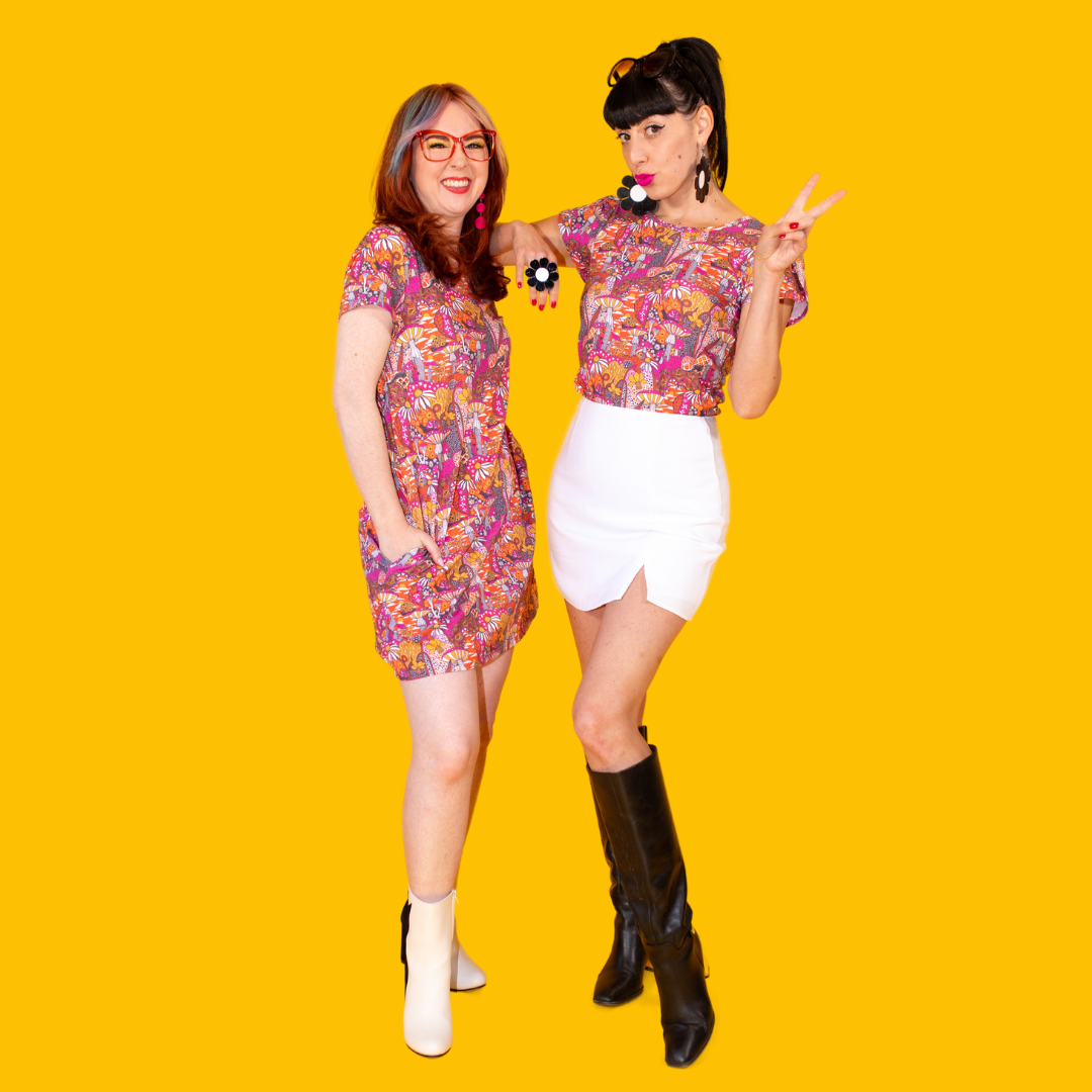We have made our classic tulip sleeved tee in a more cropped version. This one features our mushroom print in a stunning new colorway reminiscent of a sunset sky.