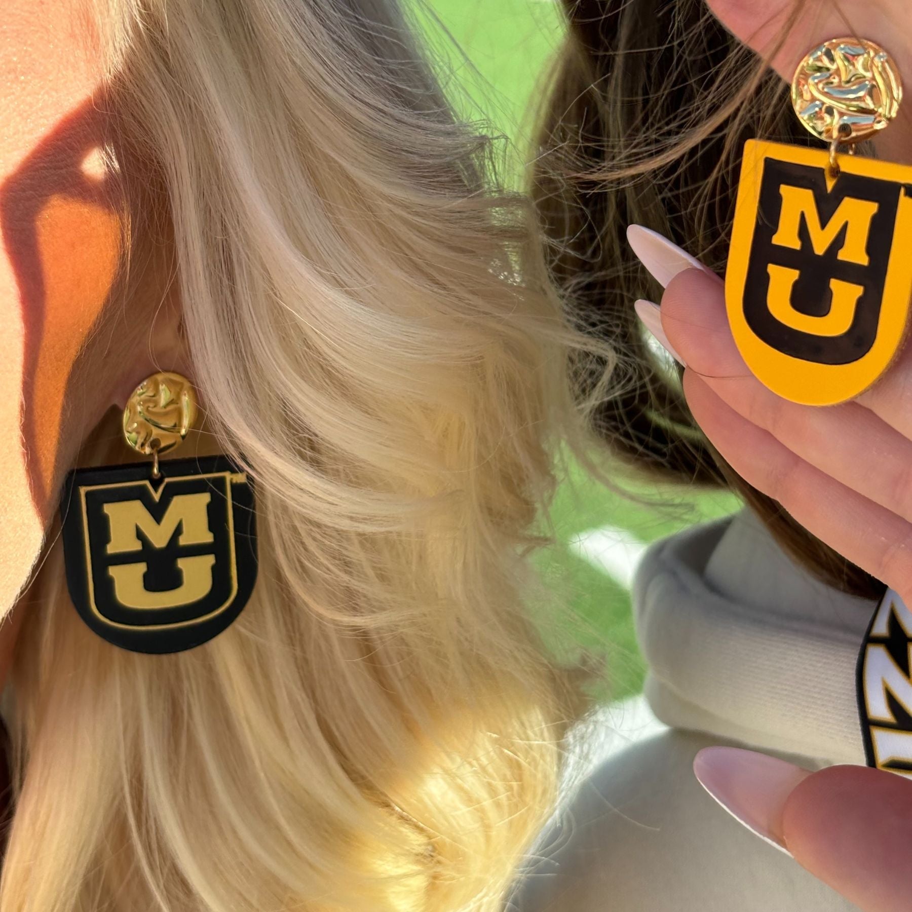 Elevate your game day look with our Black University of Missouri Harpers. A cute and chic game day earring that's perfect for showing off your Mizzou team spirit in style. These gold and black post earrings are a bold way to show your school spirit.