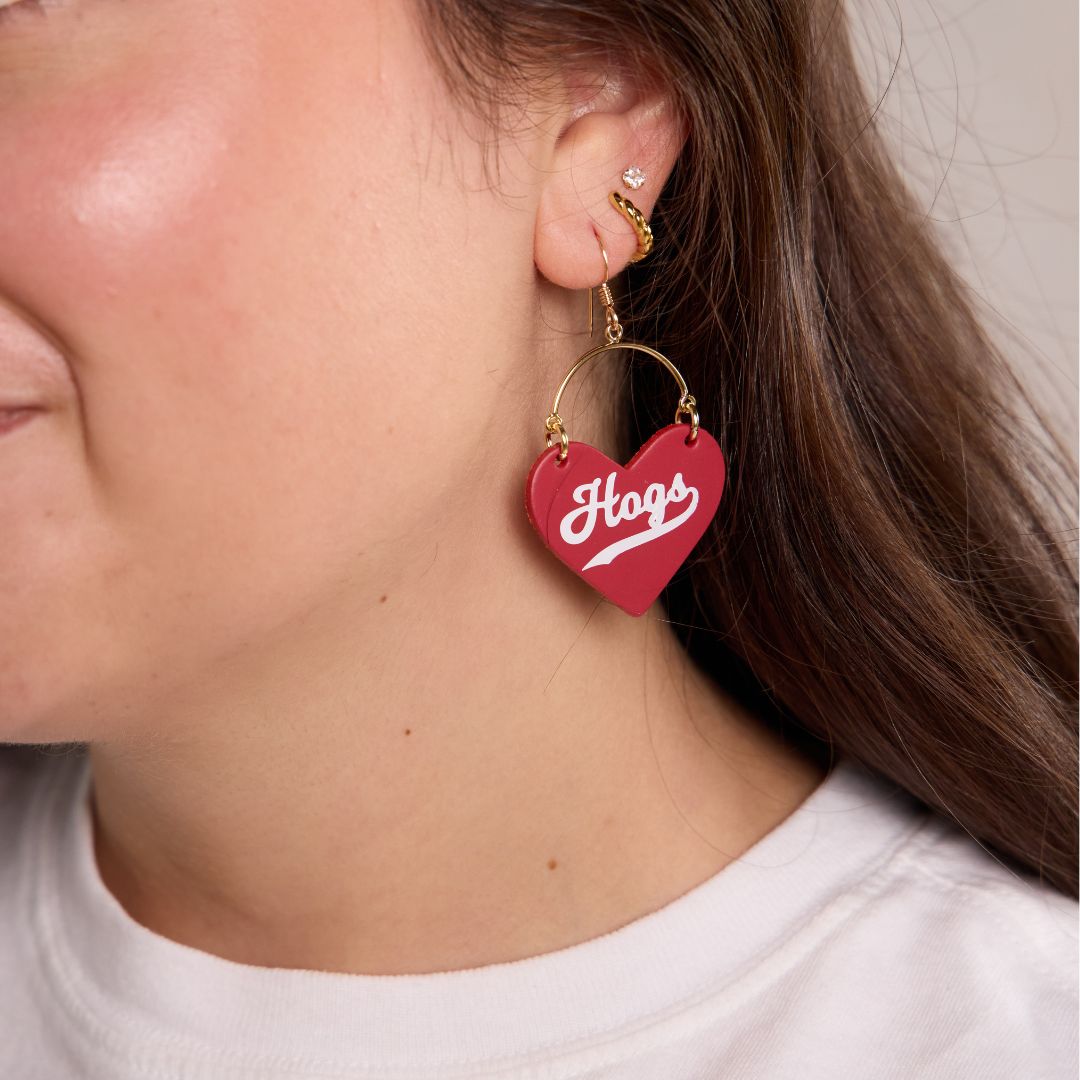 Elevate your gameday look with our University of Arkansas Lover leather earrings - the perfect accessory for passionate fans, proud alumni, and stylish students. These officially licensed earrings are crafted and hand-embossed in Kansas City from premium Italian leather for a standout look.