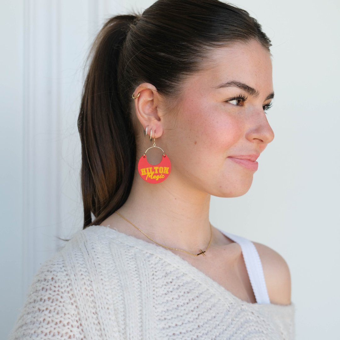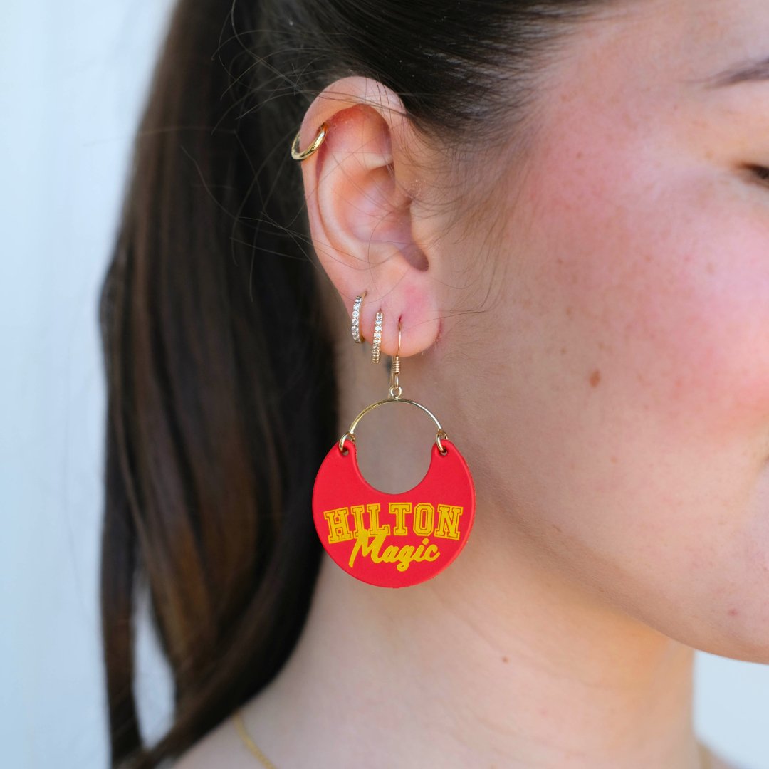 Elevate your game day look with our Cyclone Cardinal Iowa State University Hilton Magic Ninas. A cute and chic game day earring that's perfect for showing off your team spirit in style. These cardinal and gold Nina earrings are perfect for showing off your Iowa State University pride!