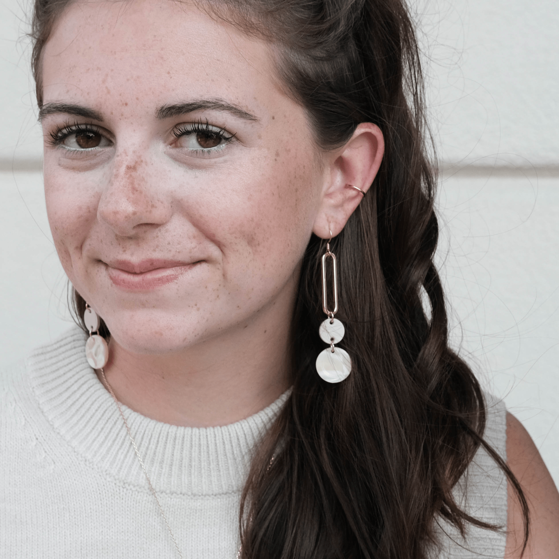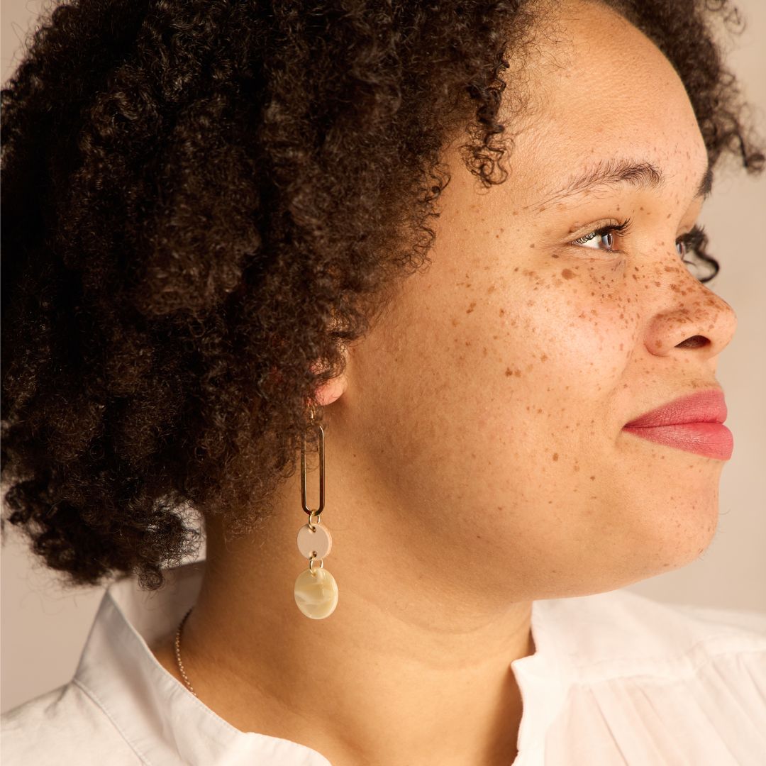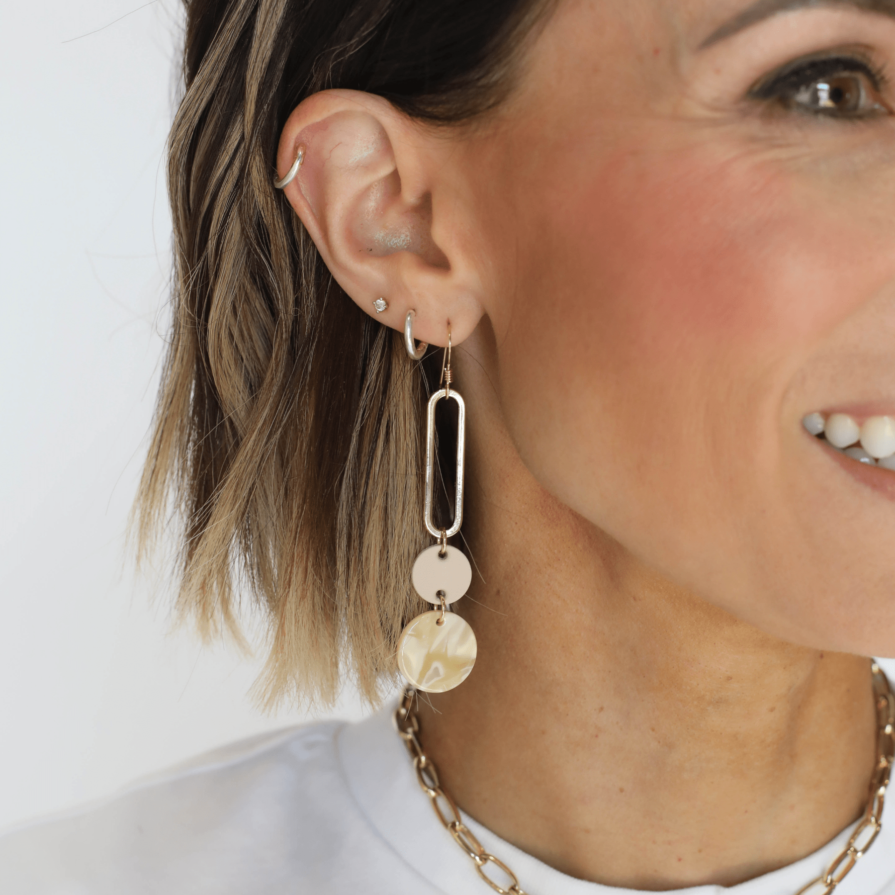 Soft Sand Stevies feature smooth, warm neutral tone leather with a pearlescent resin component. These accent pieces are attached to gold hardware for a modern lightweight earring, perfect for year-round wear.