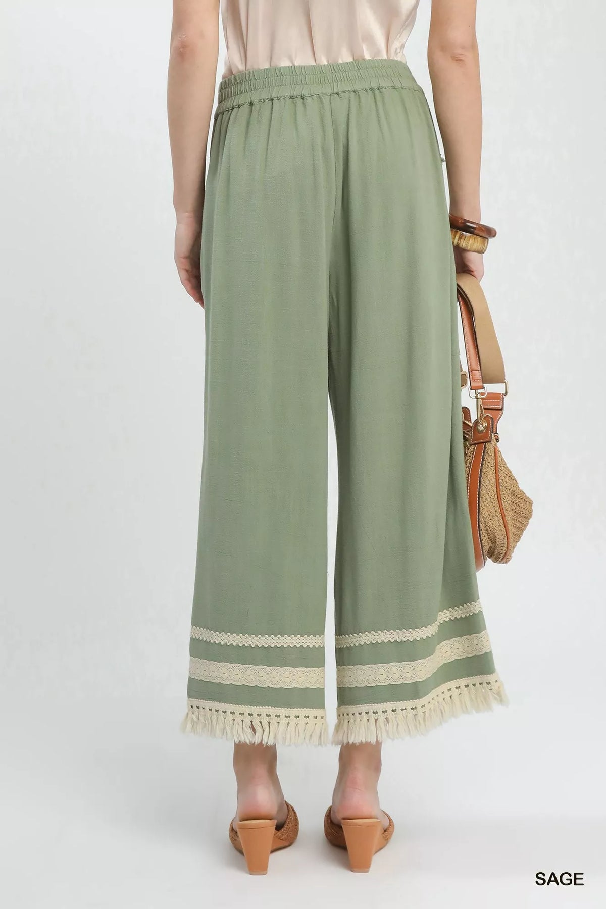 These wide-leg pants are made from a comfortable linen blend that is perfect for warm weather. The addition of lace trim adds a stylish and feminine touch to the design. With side pockets for convenience, these pants strike the perfect balance between fashion and functionality. While they are not lined, they are still a great choice for a chic and comfortable outfit. Embrace a bohemian vibe with these fringe hem wide-leg pants that are sure to elevate your casual wardrobe.