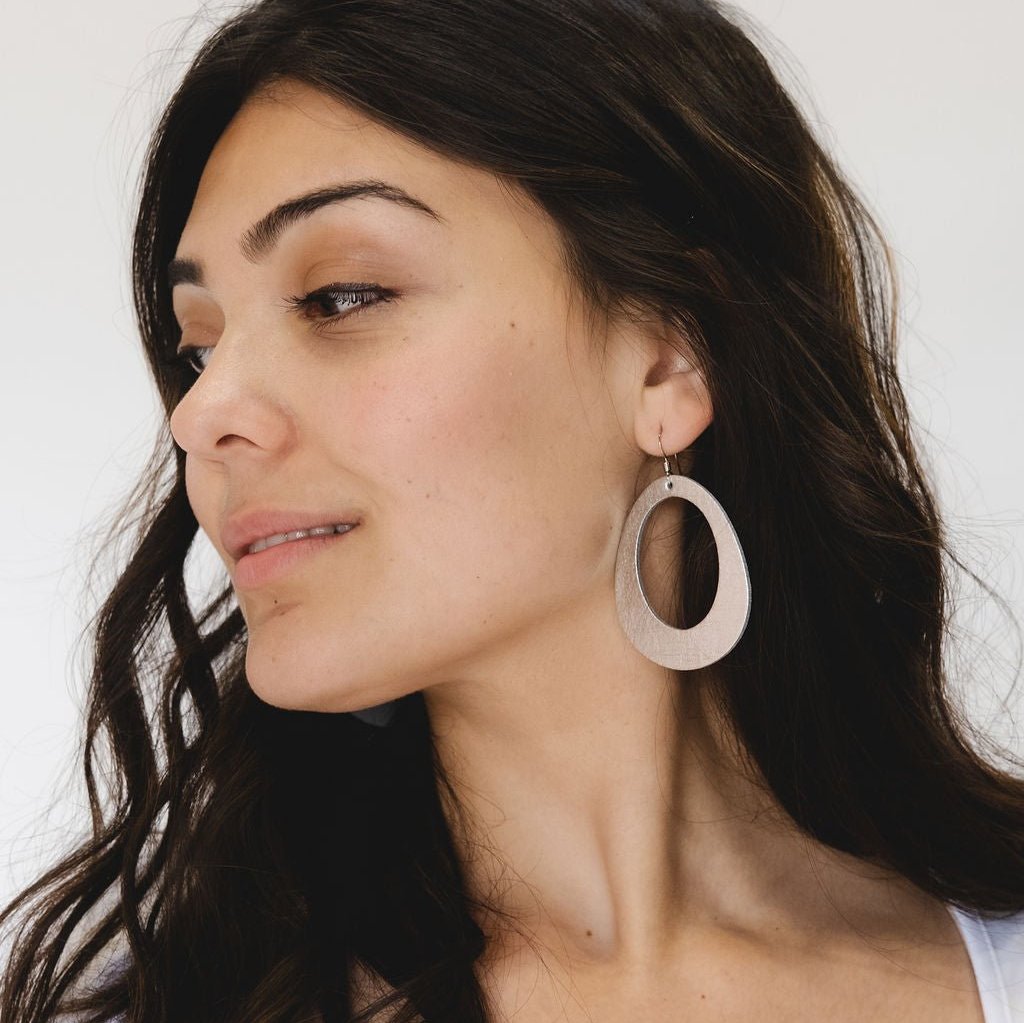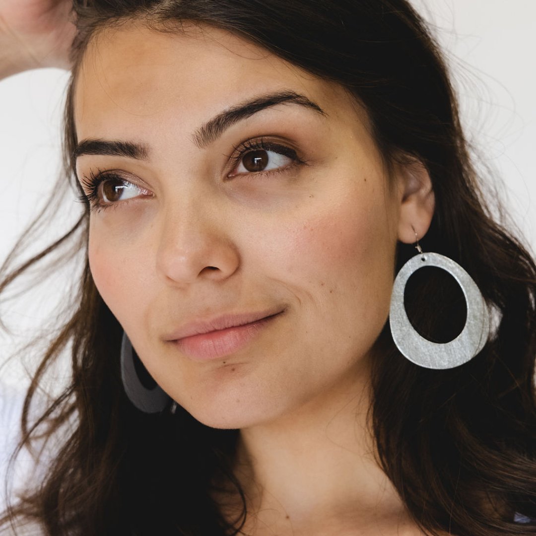 Willows are a round statement earring inspired by organic design. These lightweight earrings are available in two sizes and are made with cool-toned metallic Vintage Silver leather.