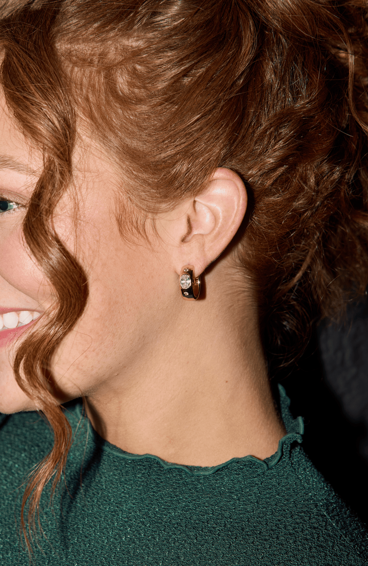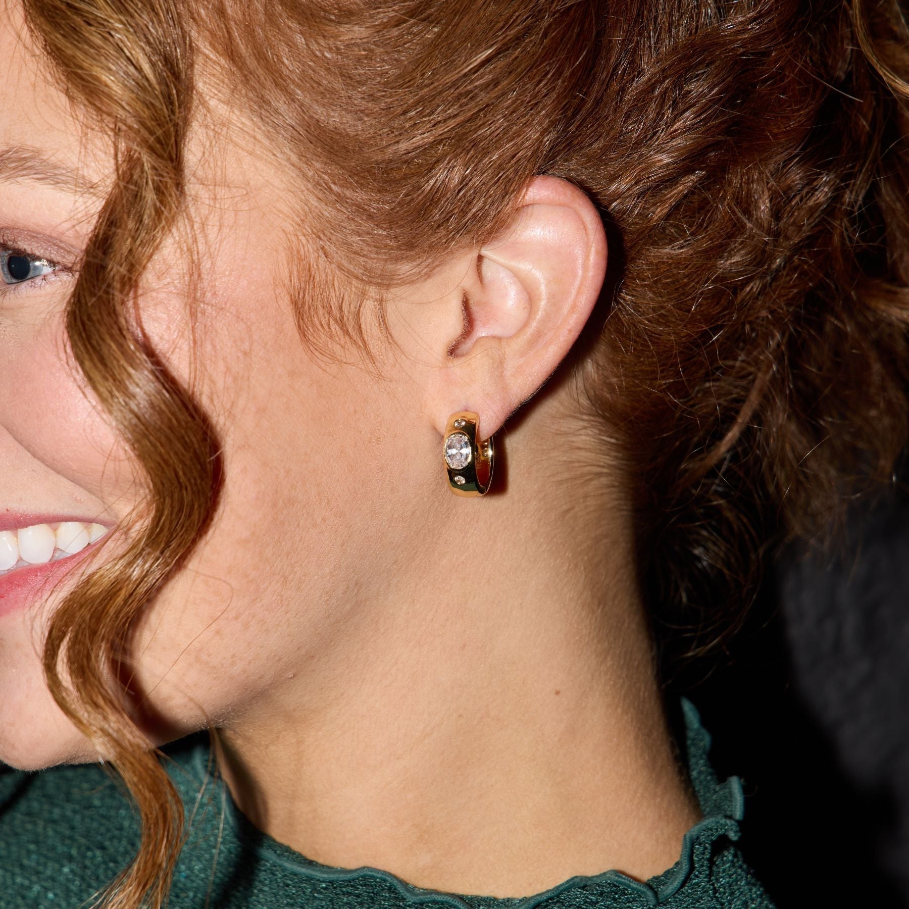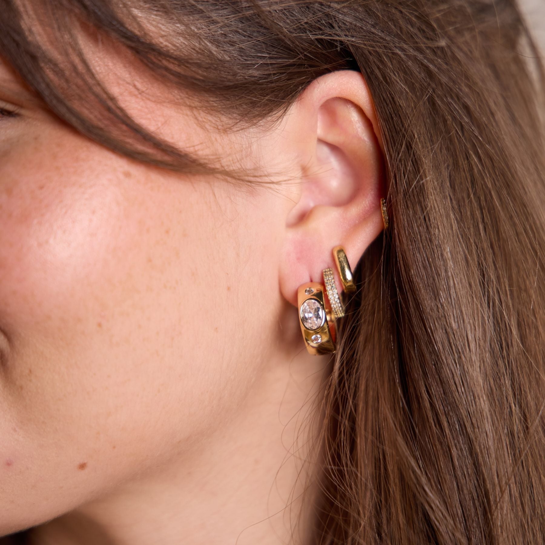 The Wide CZ Bezel Hoops feature a gleaming set of three set stones. This statement hoop is versatile for any look, day to night.