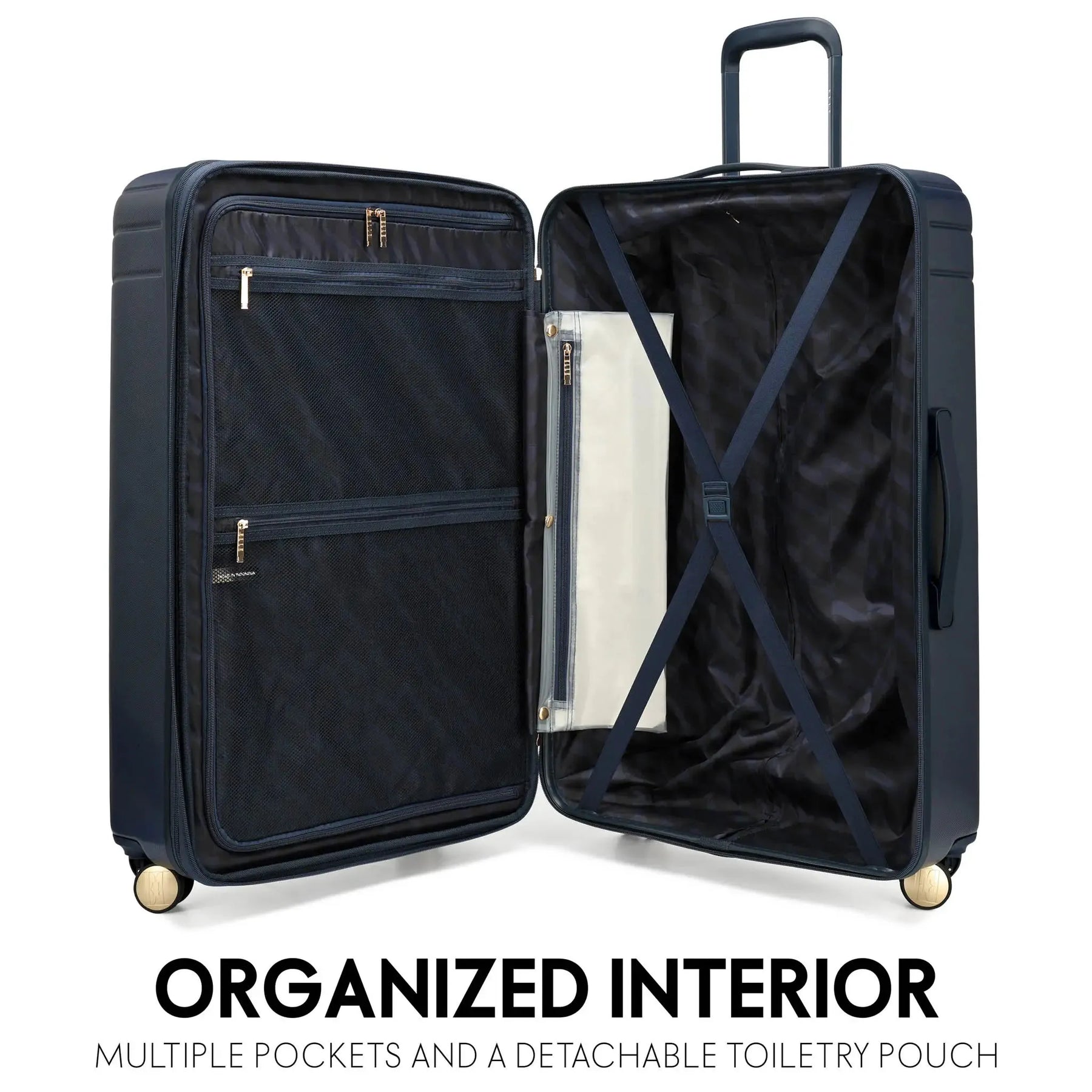 Discover the perfect travel companion with the ELLE Louvre collection. Designed for the modern traveler, this premium 2-piece set is crafted from 100% polycarbonate, offering both durability and style. Each piece features fully lined interiors with two mesh pockets and a detachable PVC pocket, ensuring your belongings are organized and secure throughout your journey.