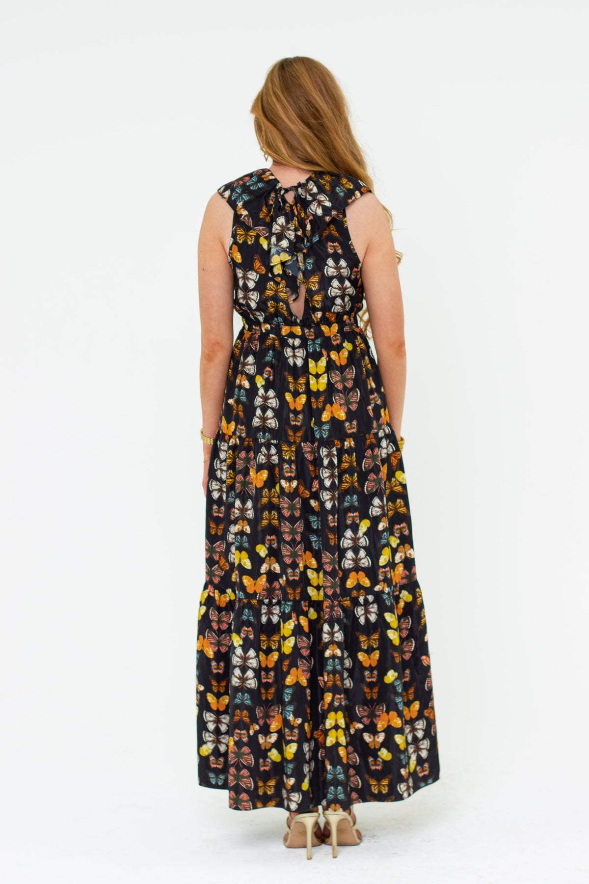 The butterfly trend isn't going anywhere anytime soon! We're bringing you our Crawford maxi in our babe-favorite Mariposa print. This silhouette features a plunging neckline with ruffle detailing, plunging back with tie closure, and an elastic waist for a flattering fit.