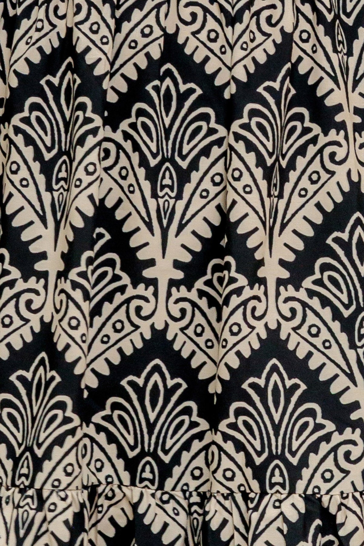 A printed woven maxi dress featuring sweetheart neckline, straps, tiered skirt and smocked back bodice