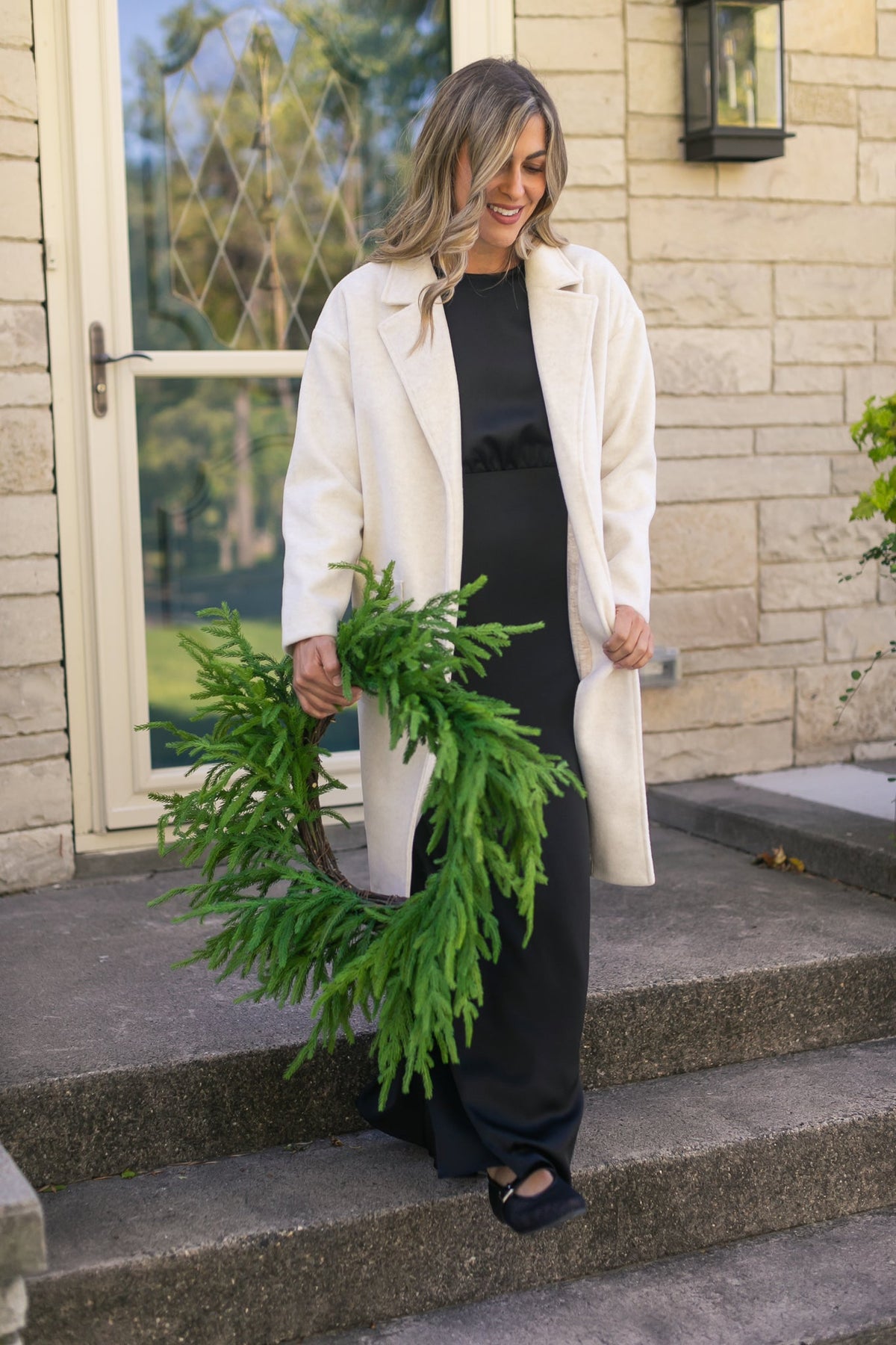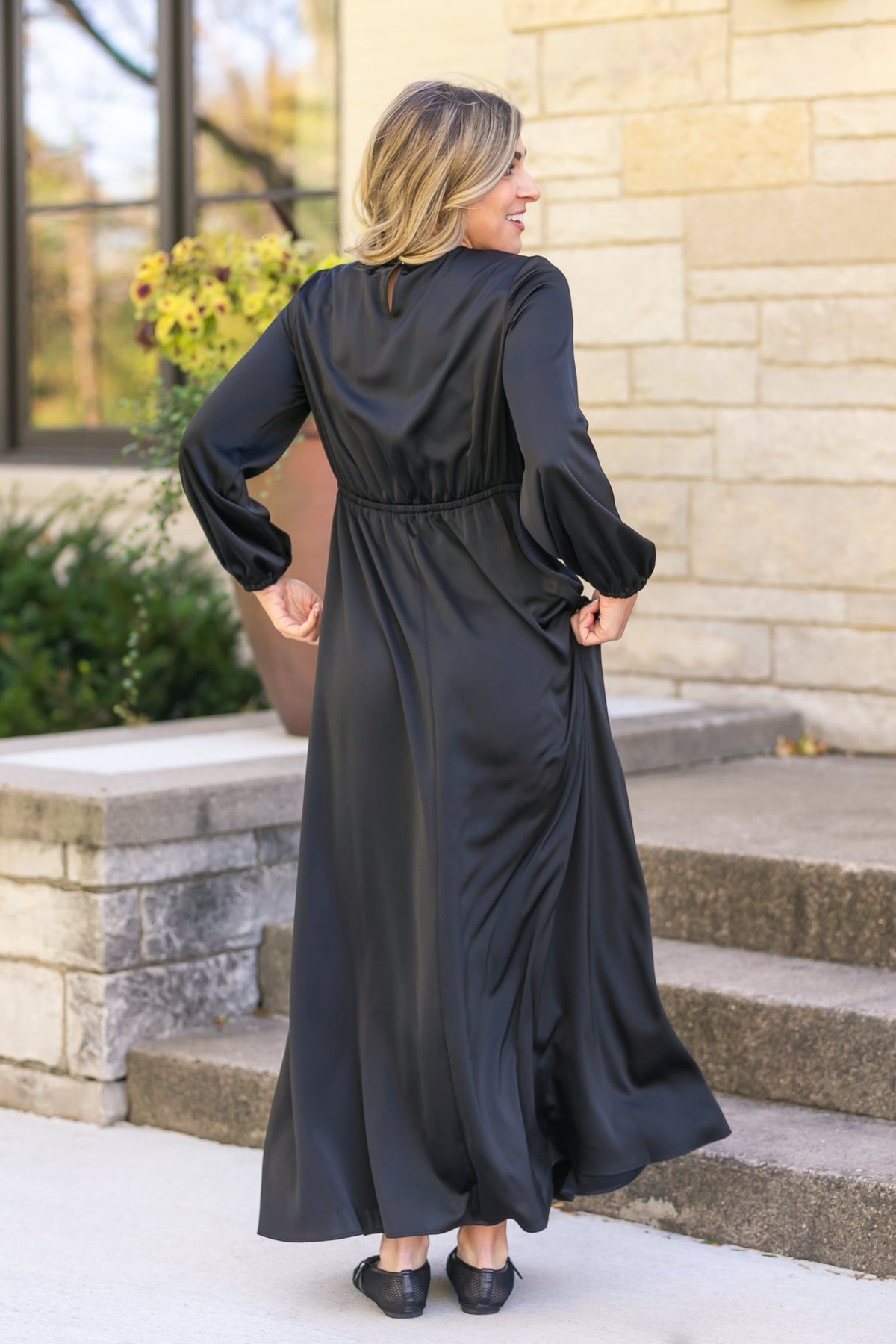 The Muriel Maxi Dress is the epitome of simple elegance, perfect for elevating your wardrobe with timeless sophistication. Designed with a flattering flat-front waist and an elasticized back for a comfortable yet tailored fit, this dress effortlessly combines style and function. The delicate elastic bell sleeves add a touch of romance, while the keyhole back closure ensures an easy and elegant finish. Made from a luxurious satin-like fabric, the Muriel flows beautifully for a graceful silhouette. Whether you're attending church, a wedding, or a formal event, this versatile dress will leave you feeling polished and classiest for any occasion!
