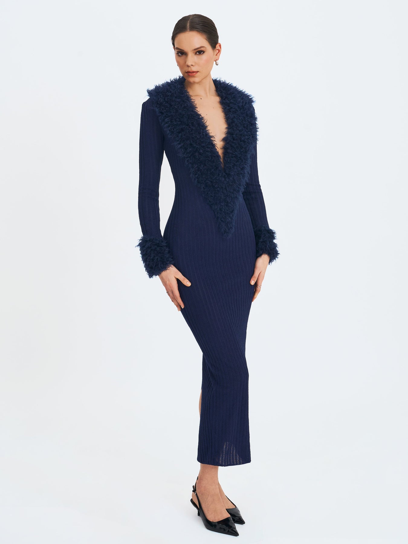 Make a memorable entrance in the Romina navy crochet mesh maxi, a sultry winter statement that proves blue is just as irresistible for Valentine’s as red. The plunging V-neckline is framed with plush faux fur, matched by soft fur-trimmed cuffs that add a touch of cozy glamour to the body-hugging silhouette. Fully lined in mesh for comfort that moves with you, it features an invisible back zipper and vent for effortless wear. Perfect for candlelit dinners, rooftop dates, or any evening where you want warmth, elegance, and a little unexpected allure.
