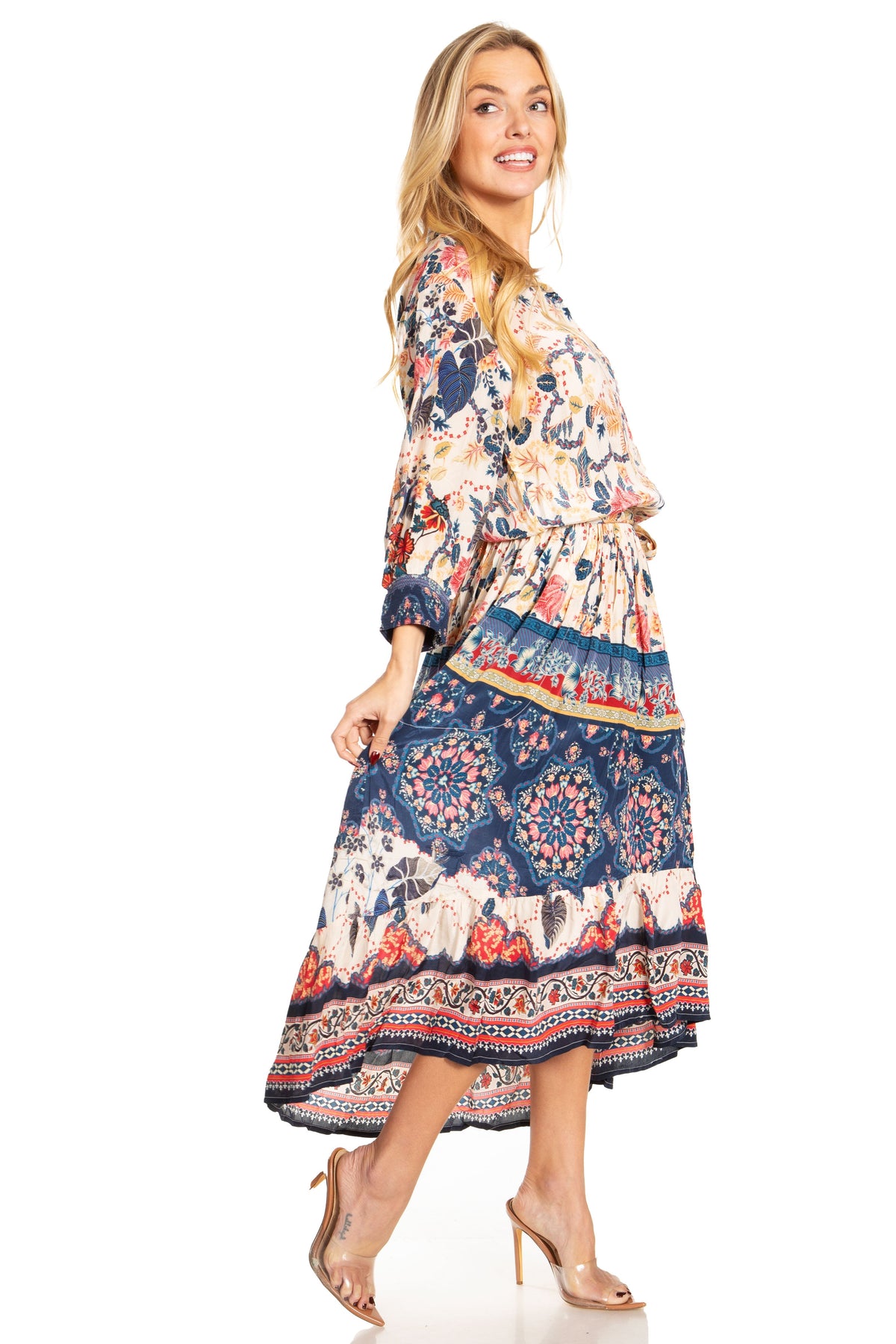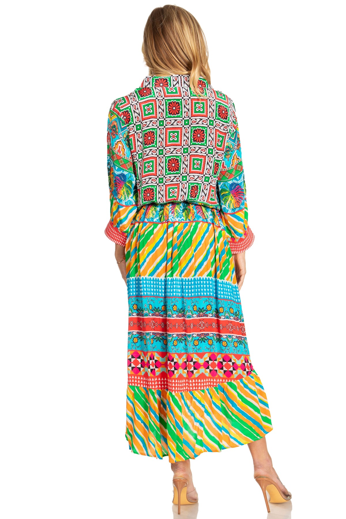• Shirt Dress/ Maxi/ Caftan/ Event: Andreas, the most amazing boho maxi dress! Comes with a shirt collar, partially buttons down at front, 3/4 sleeves with smock elastic cuffs, elastic waist, side pockets, ruffled flounce bottom, comes with matching belt, pullover style. Made with lightweight silky like material, finished with vibrant print. A truly one of a kind!