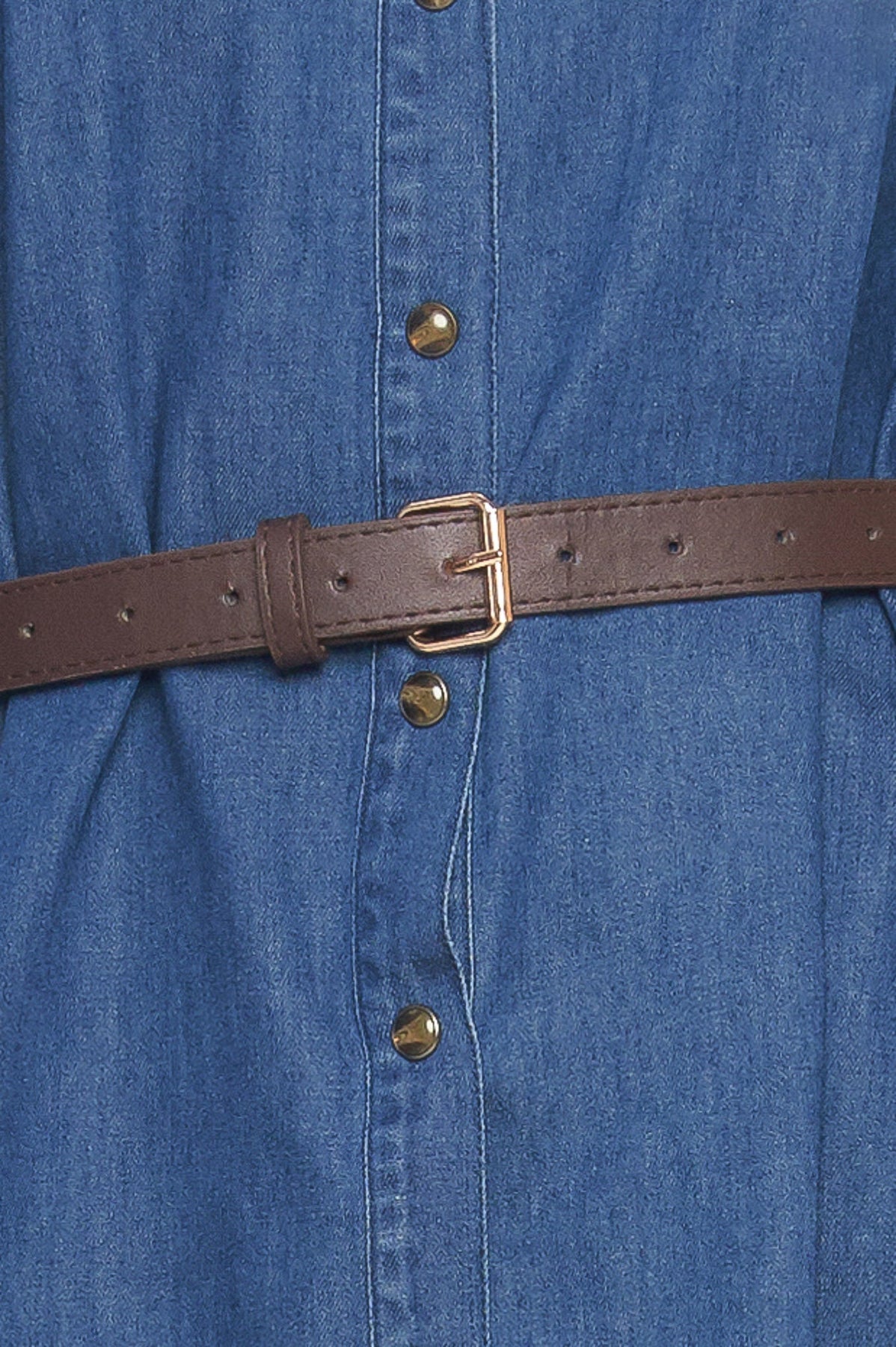 A denim mini dress featuring collar, square yoke with ruffles, long sleeve, front button down and contrasting belt