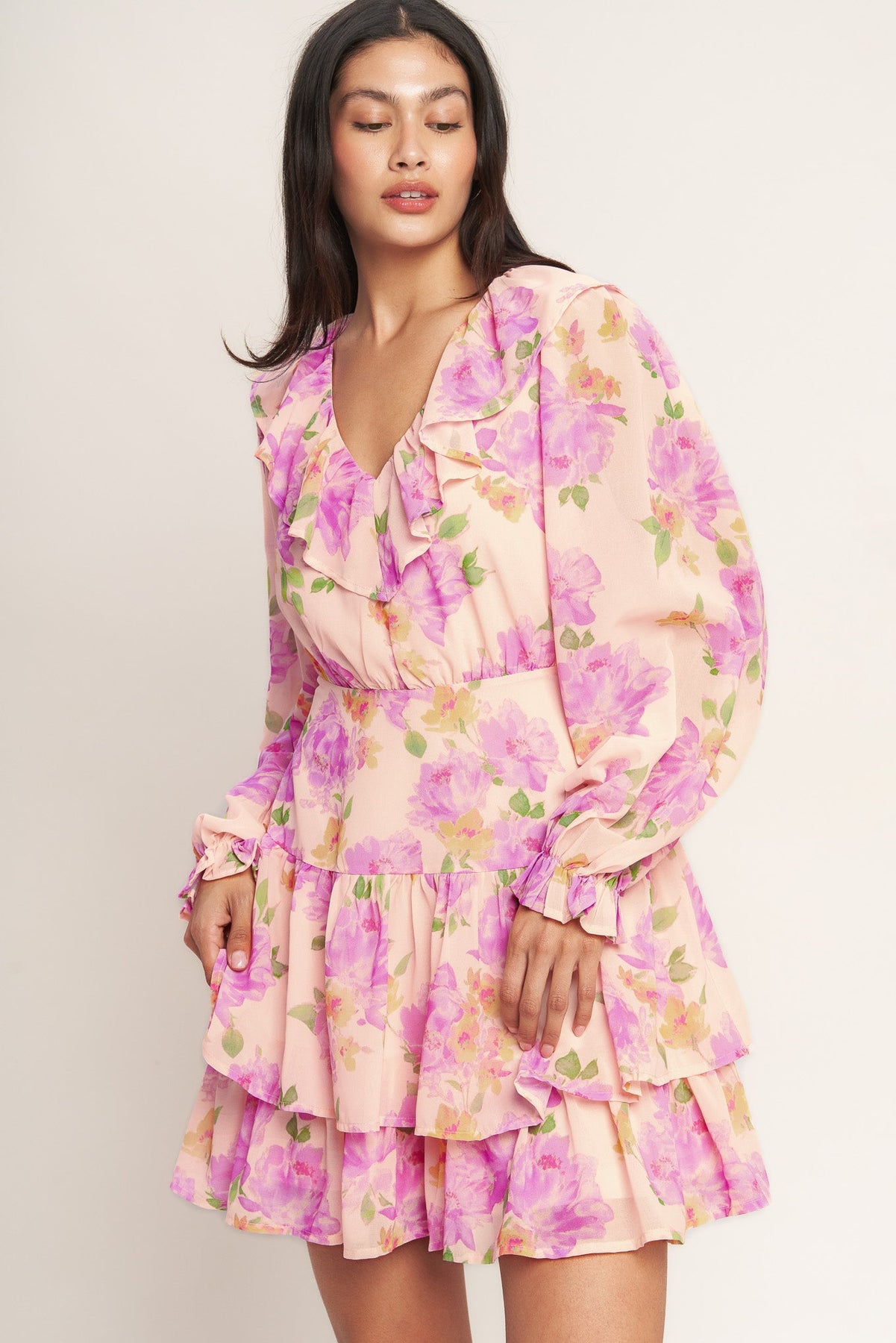 A printed woven mini dress featuring V neckline with ruffle, long sleeve, double layer ruffle hem and side zipper closure