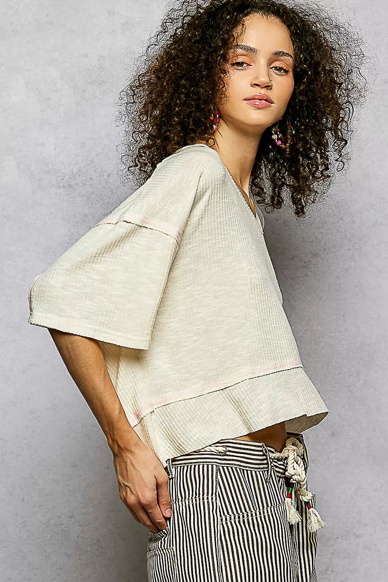 This round neck half sleeve top offers a relaxed fit for a casual and comfortable style. The ribbed texture adds a hint of dimension to the design. Contrast stitch detailing creates a visually interesting element to the top. The round neck provides a classic silhouette that is easy to style. Perfect for everyday wear, this top is versatile and effortlessly chic.
