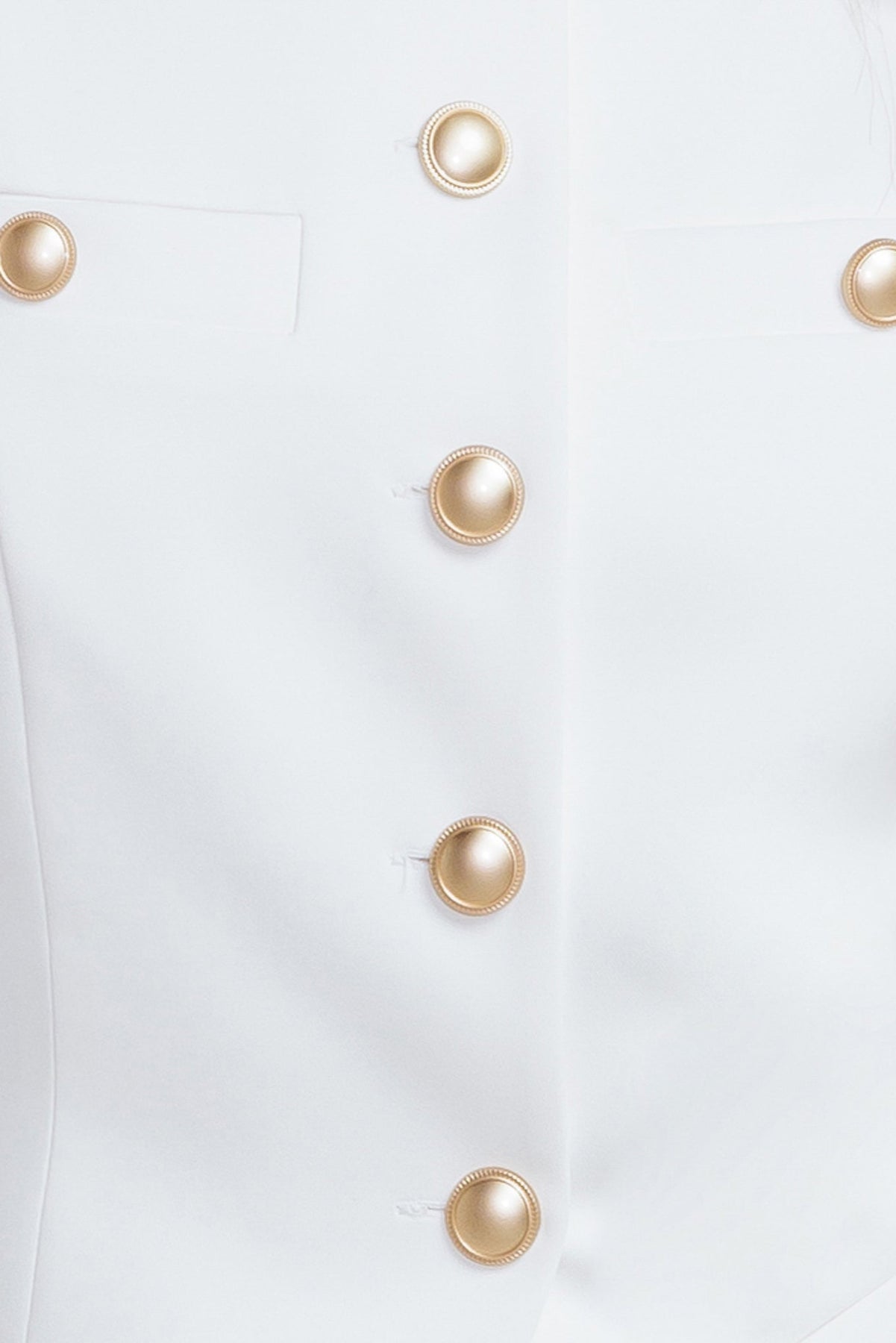 A solid woven vest featuring round neckline, sleeveless and button down closure.