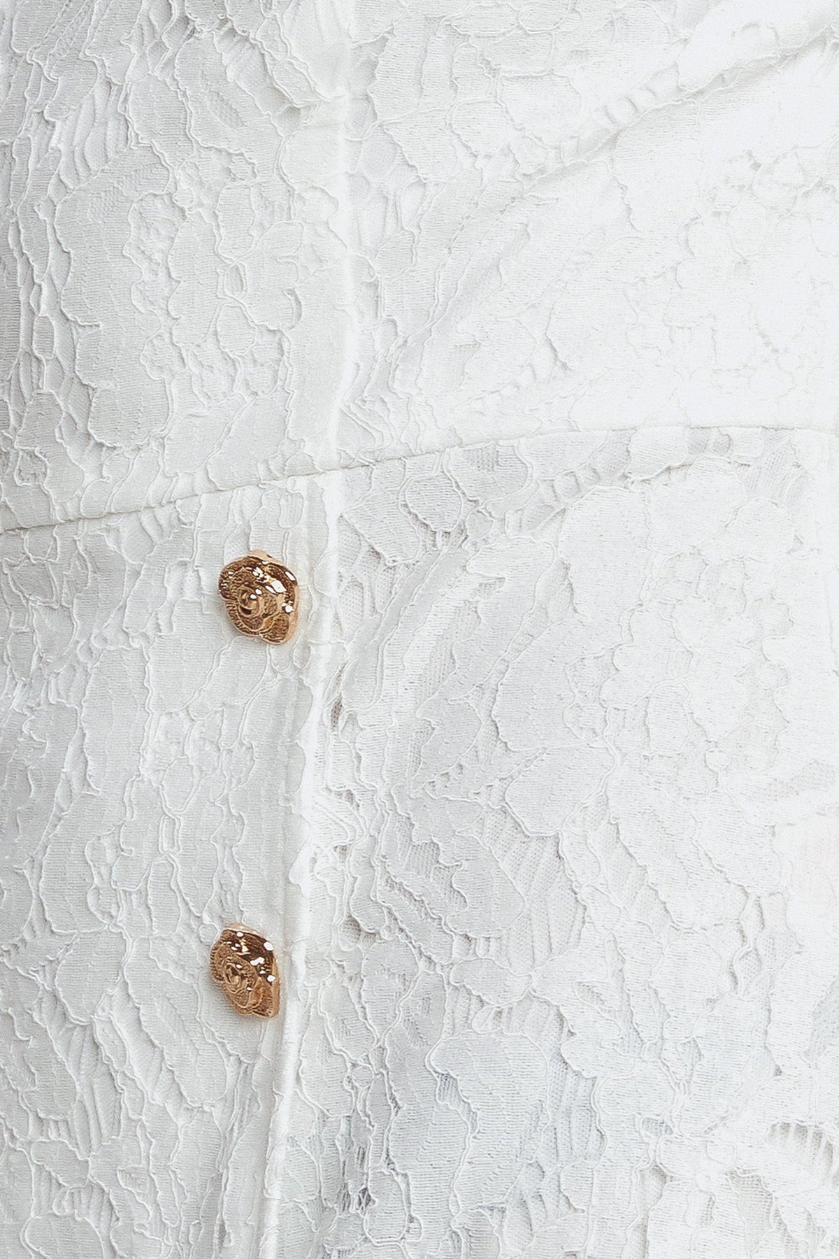 A washed denim skort featuring embroidered ruffle hem and side zipper closure
